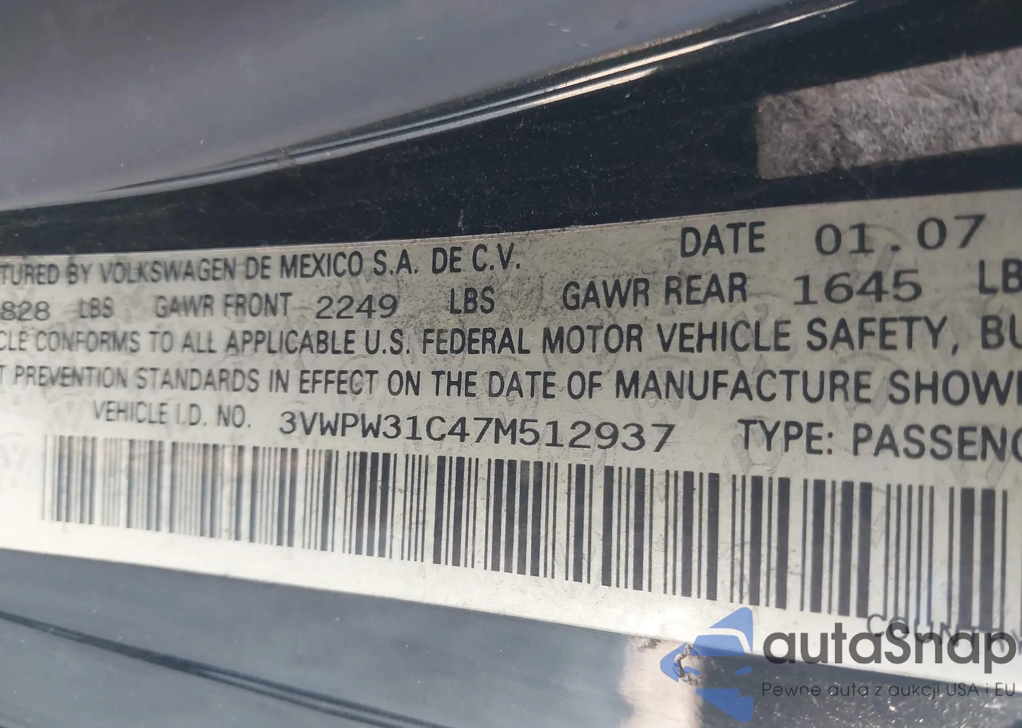 • VIN: 3VWPW31C47M512937