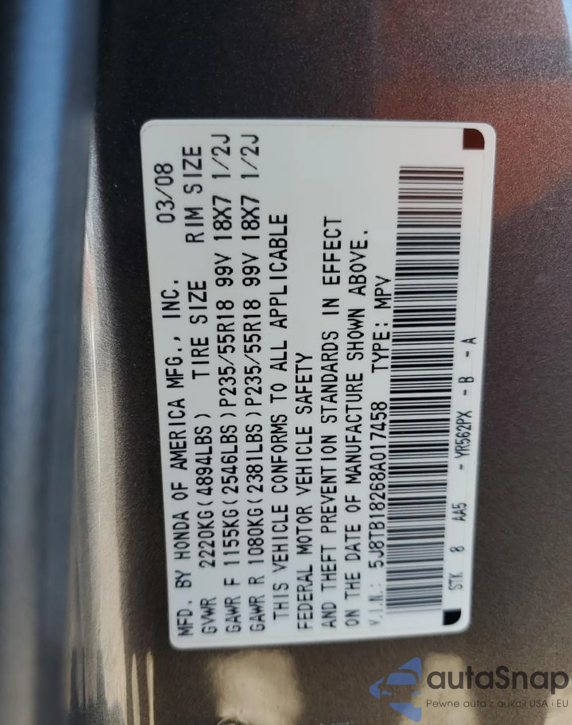 VIN: 5J8TB18268A017458