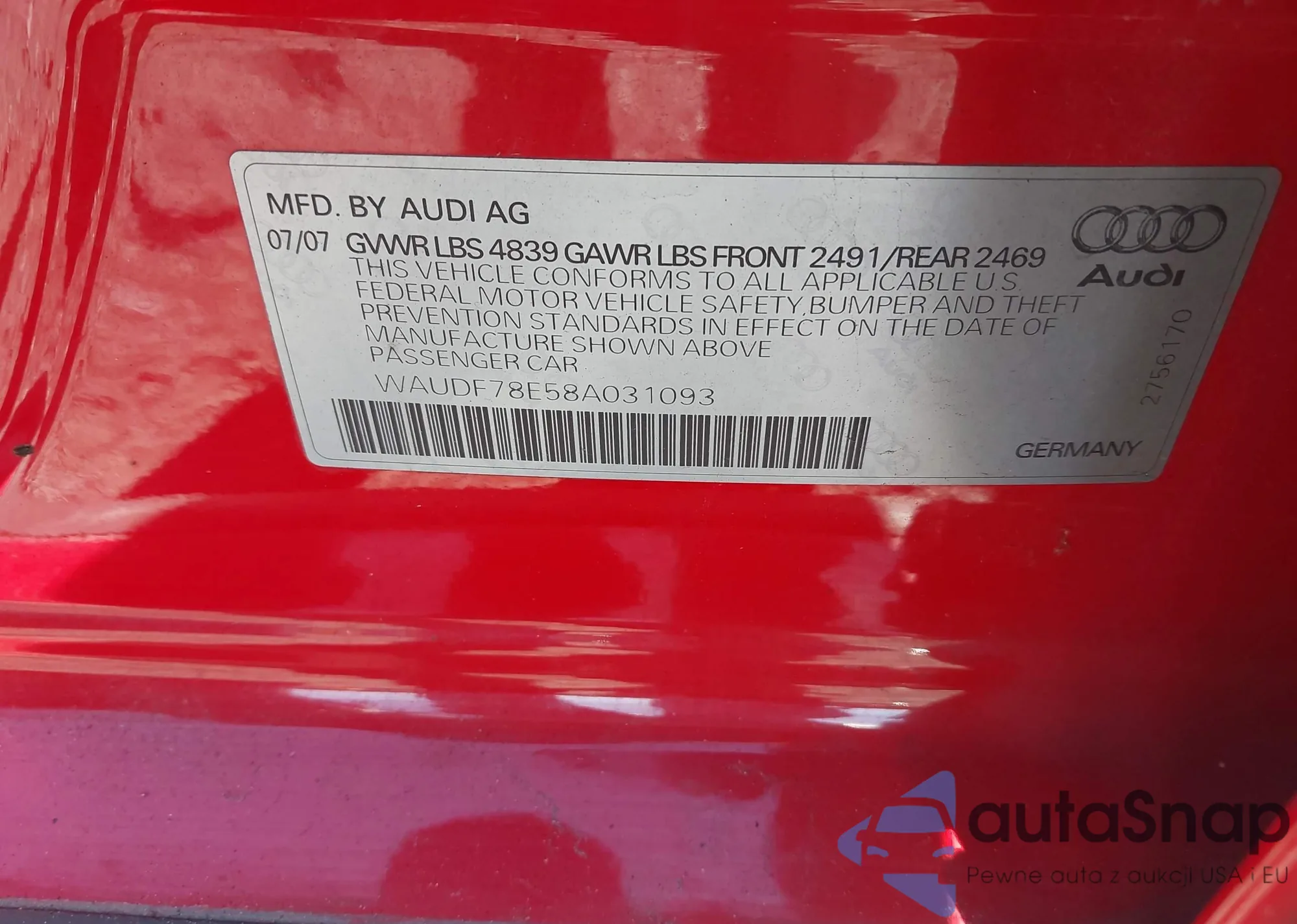 Samochód Audi A4 2008 (VIN WAUDF78E58A031093) nie był wcześniej licytowany. Dokumenty są czyste, przebieg odpowiada lub jest niższy niż średnia rynku. Sprzedaje go firma ubezpieczeniowa – polecamy zakup. Dostawa do portu zajmie ok. 6–8 tygodni.