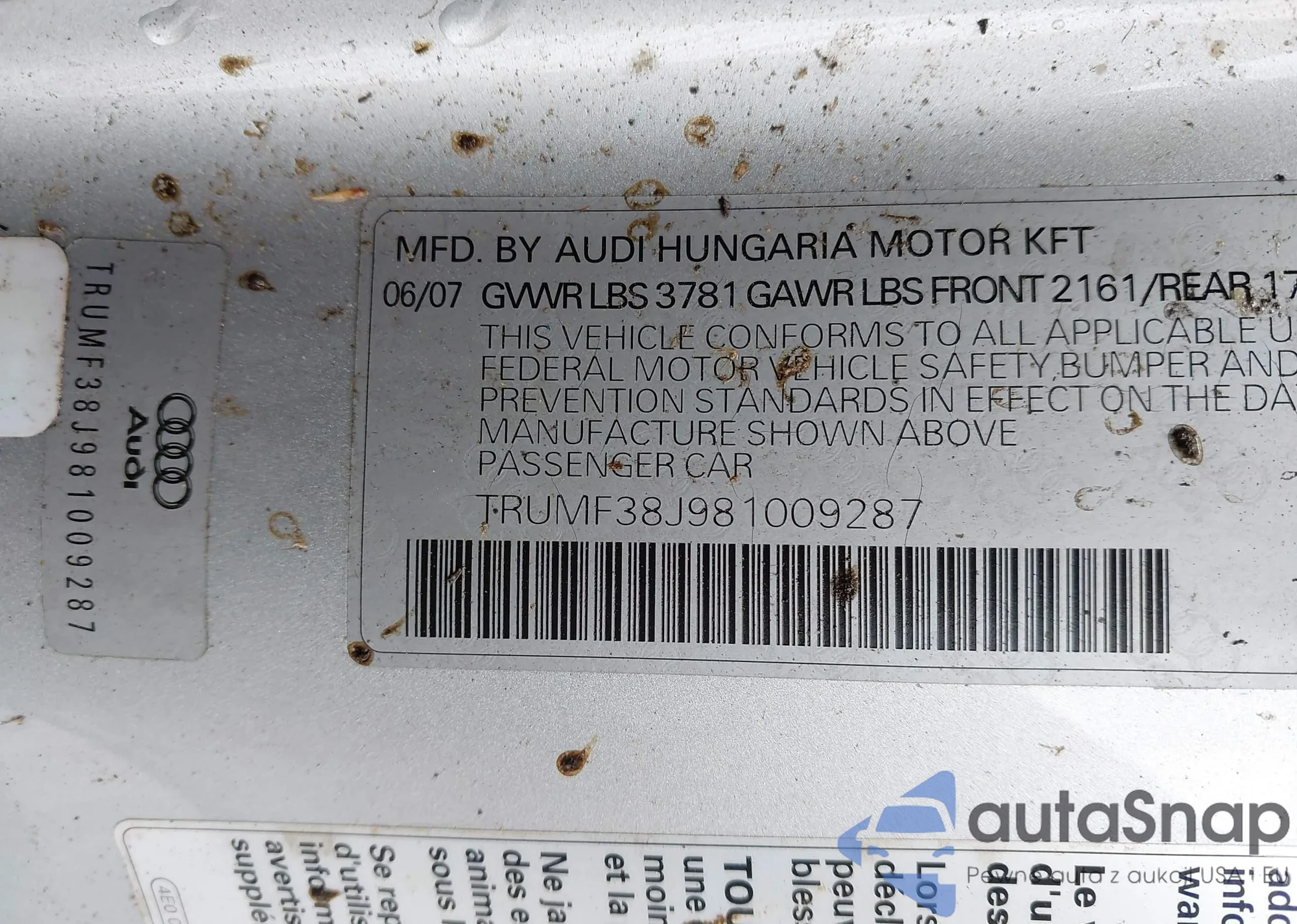 Samochód Audi TT 2008 (VIN TRUMF38J981009287) ma dokumenty uniemożliwiające rejestrację. Mogą pojawić się trudności przy eksporcie i rejestracji. Skontaktuj się z ekspertami AutaSnap w celu znalezienia alternatywy.