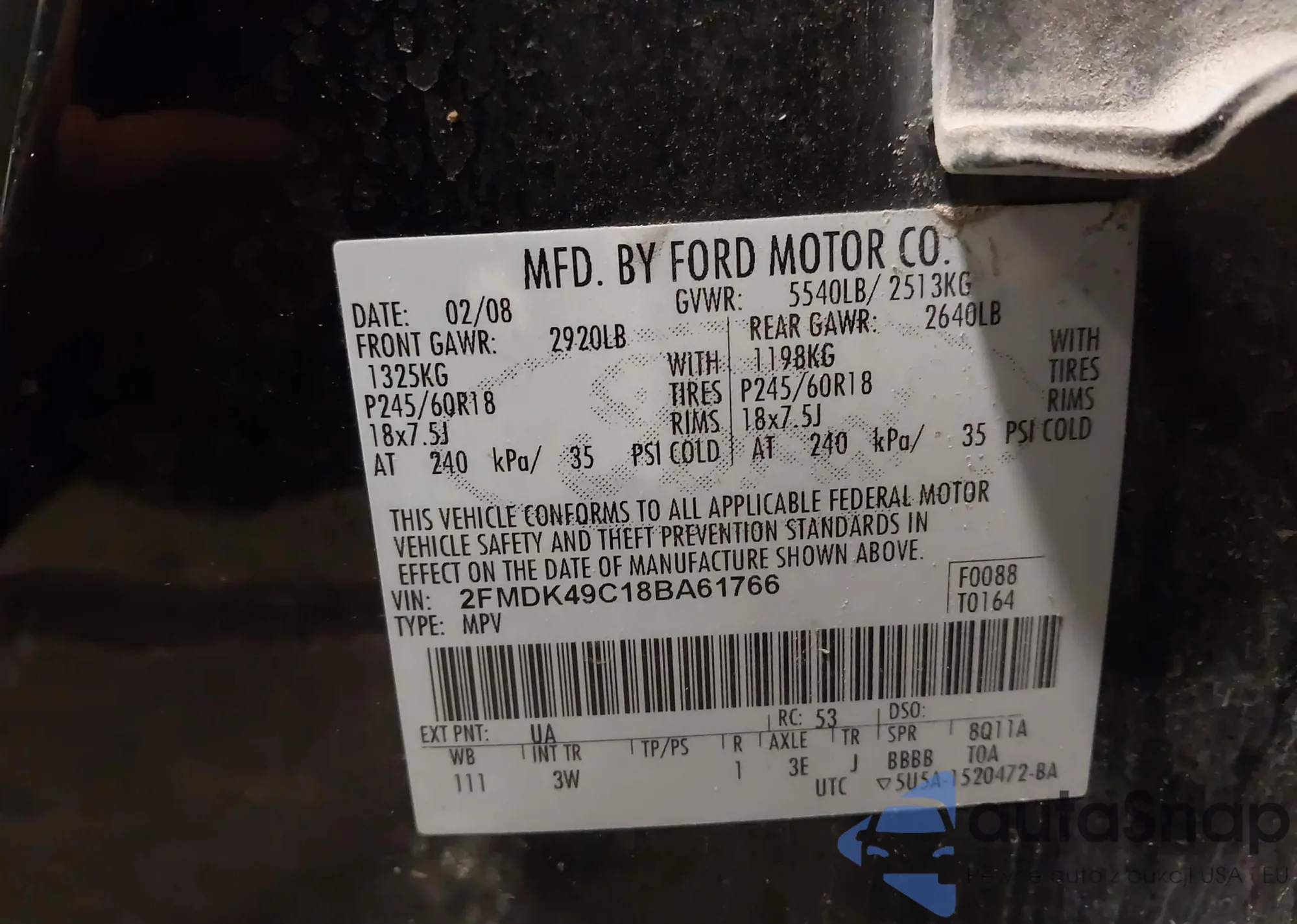 Samochód Ford Edge 2008 (VIN 2FMDK49C18BA61766) nie był wcześniej licytowany. Dokumenty są czyste, przebieg odpowiada lub jest niższy niż średnia rynku. Sprzedaje go firma ubezpieczeniowa – polecamy zakup. Dostawa do portu zajmie ok. 6–8 tygodni.