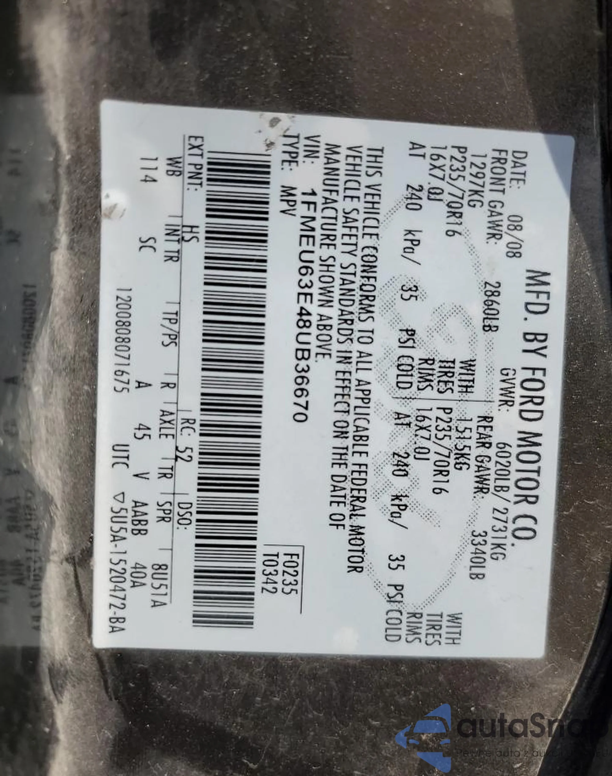 VIN: 1FMEU63E48UB36670
