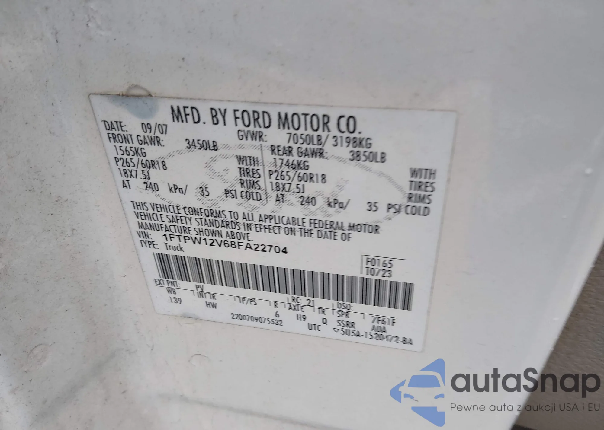 • VIN: 1FTPW12V68FA22704