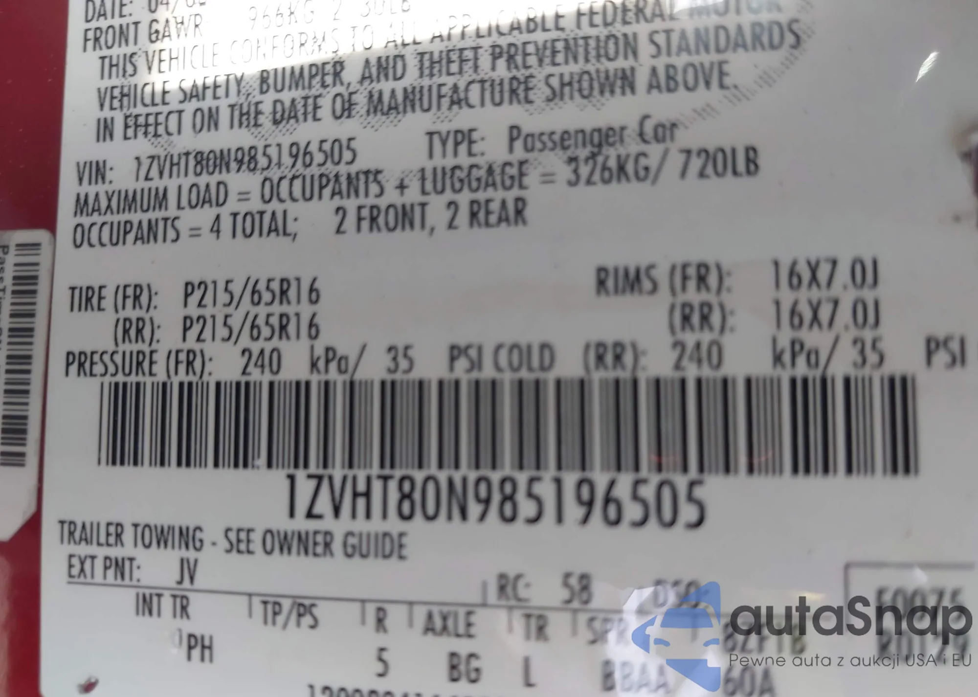 • VIN: 1ZVHT80N985196505