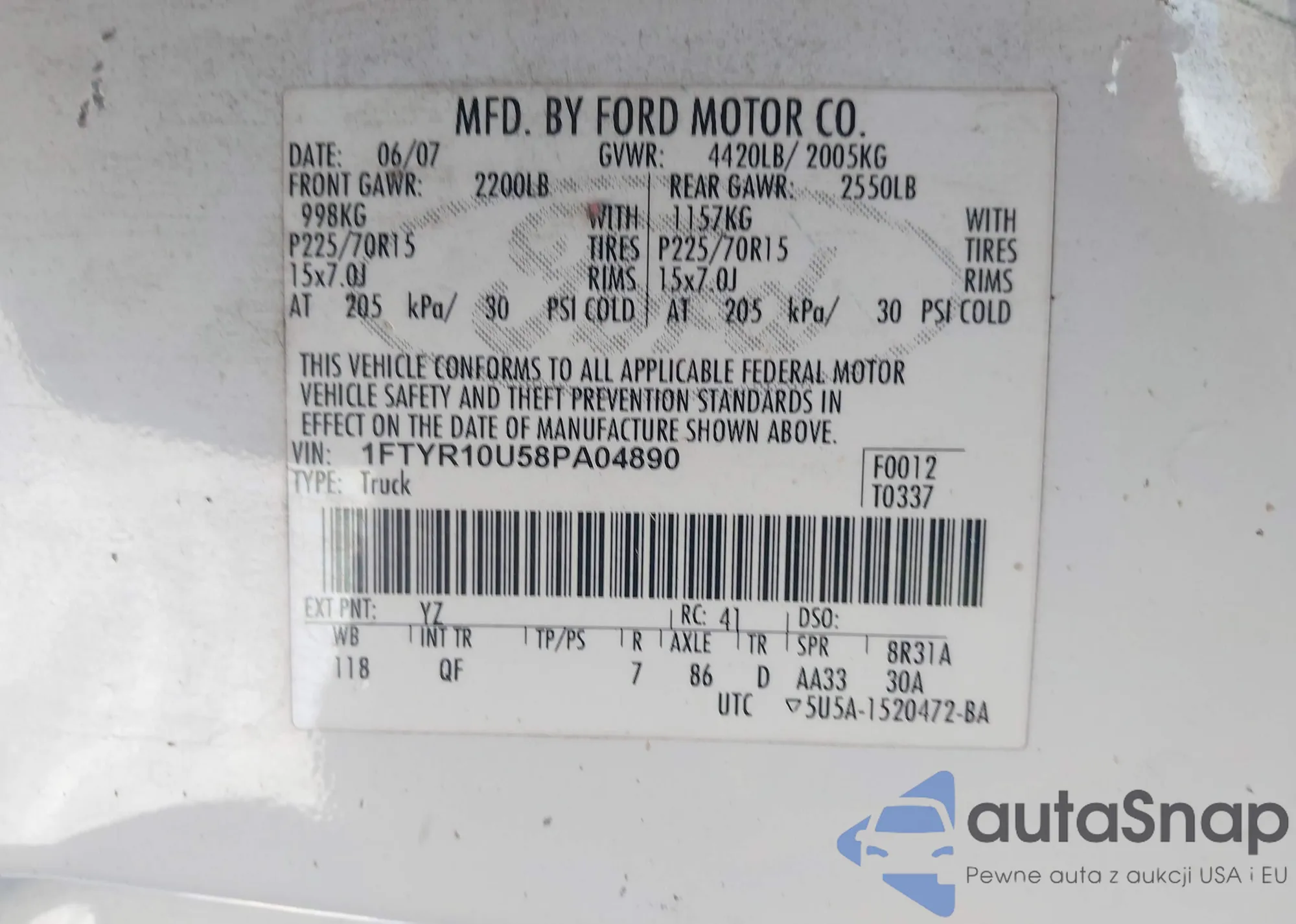 Samochód Ford Ranger 2008 (VIN 1FTYR10U58PA04890) był już licytowany 1 razy i/lub sprzedaje go niezweryfikowany sprzedawca. Zalecamy raport Carfax i potwierdzenie możliwości rejestracji pojazdu przed zakupem.