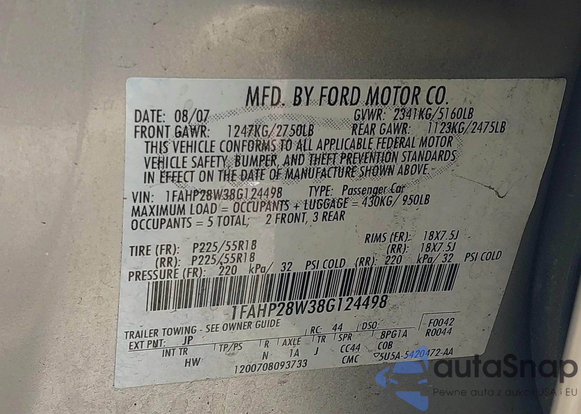 Samochód Ford Taurus 2008 (VIN 1FAHP28W38G124498) nie był wcześniej licytowany. Dokumenty są czyste, przebieg odpowiada lub jest niższy niż średnia rynku. Sprzedaje go firma ubezpieczeniowa – polecamy zakup. Dostawa do portu zajmie ok. 6–8 tygodni.