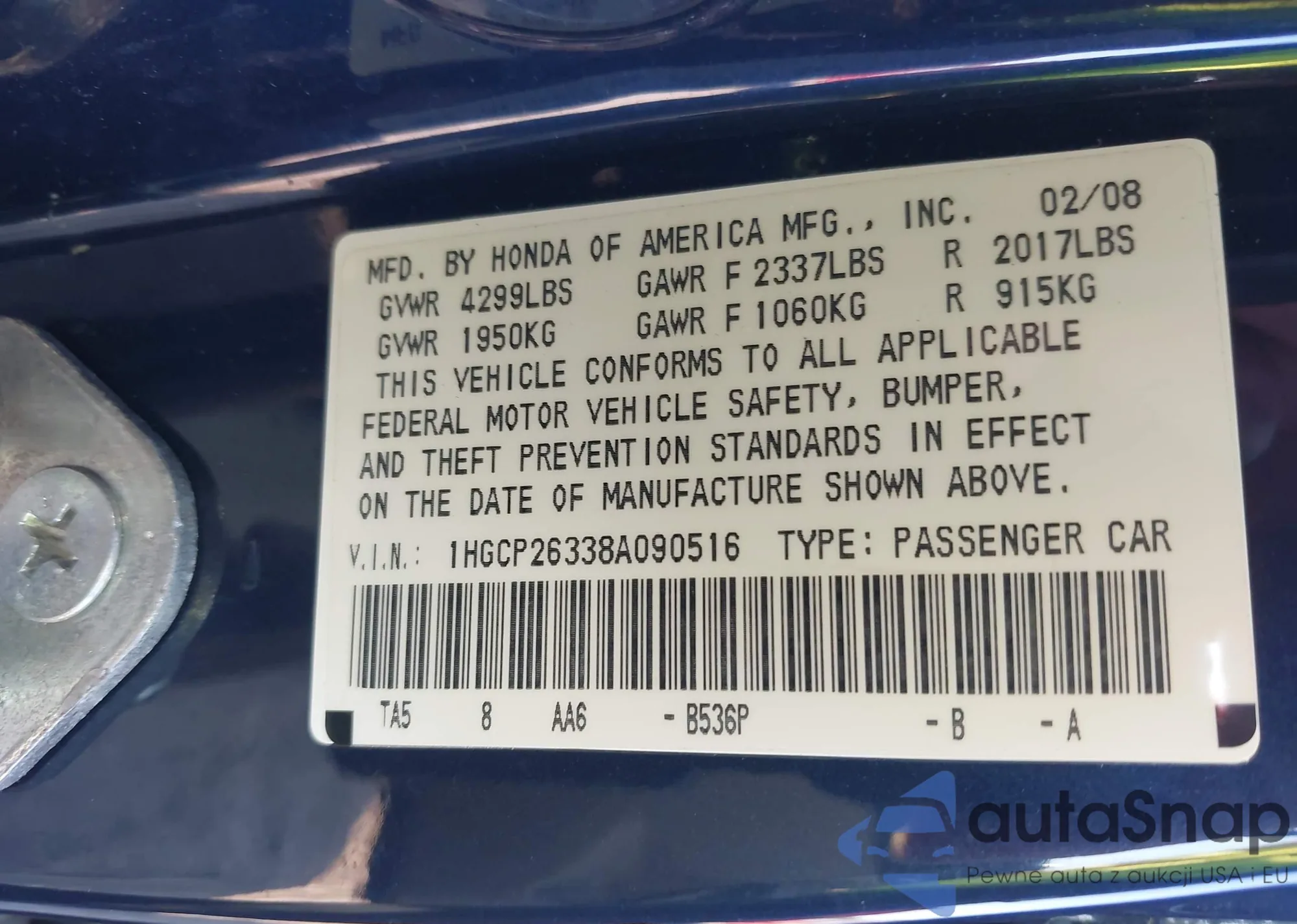 VIN: 1HGCP26338A090516