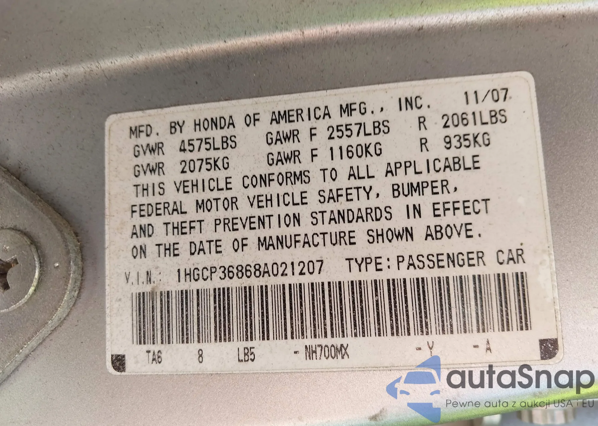 VIN: 1HGCP36868A021207