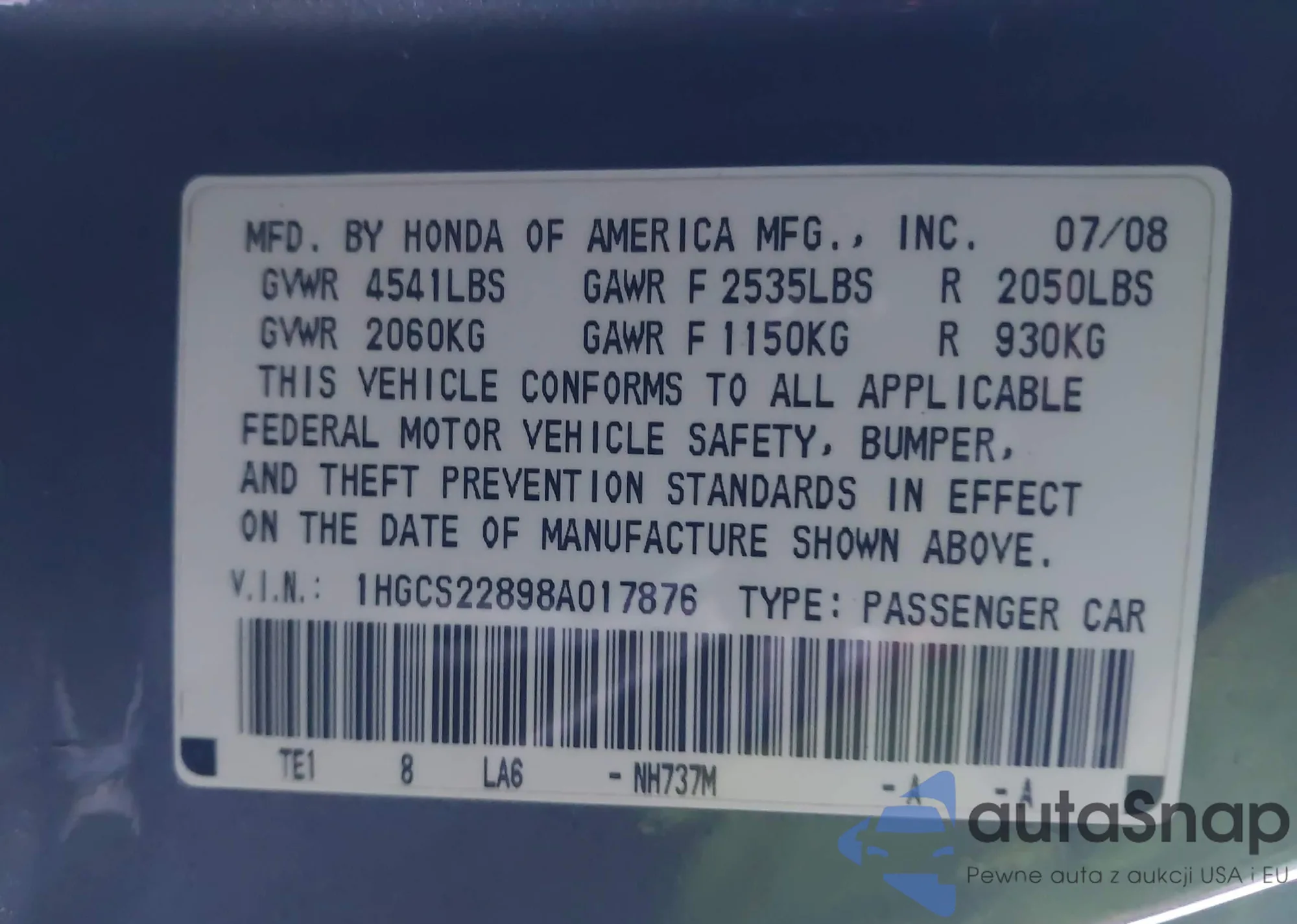 Samochód Honda Accord 2008 (VIN 1HGCS22898A017876) nie był wcześniej licytowany. Dokumenty są czyste, przebieg odpowiada lub jest niższy niż średnia rynku. Sprzedaje go firma ubezpieczeniowa – polecamy zakup. Dostawa do portu zajmie ok. 6–8 tygodni.