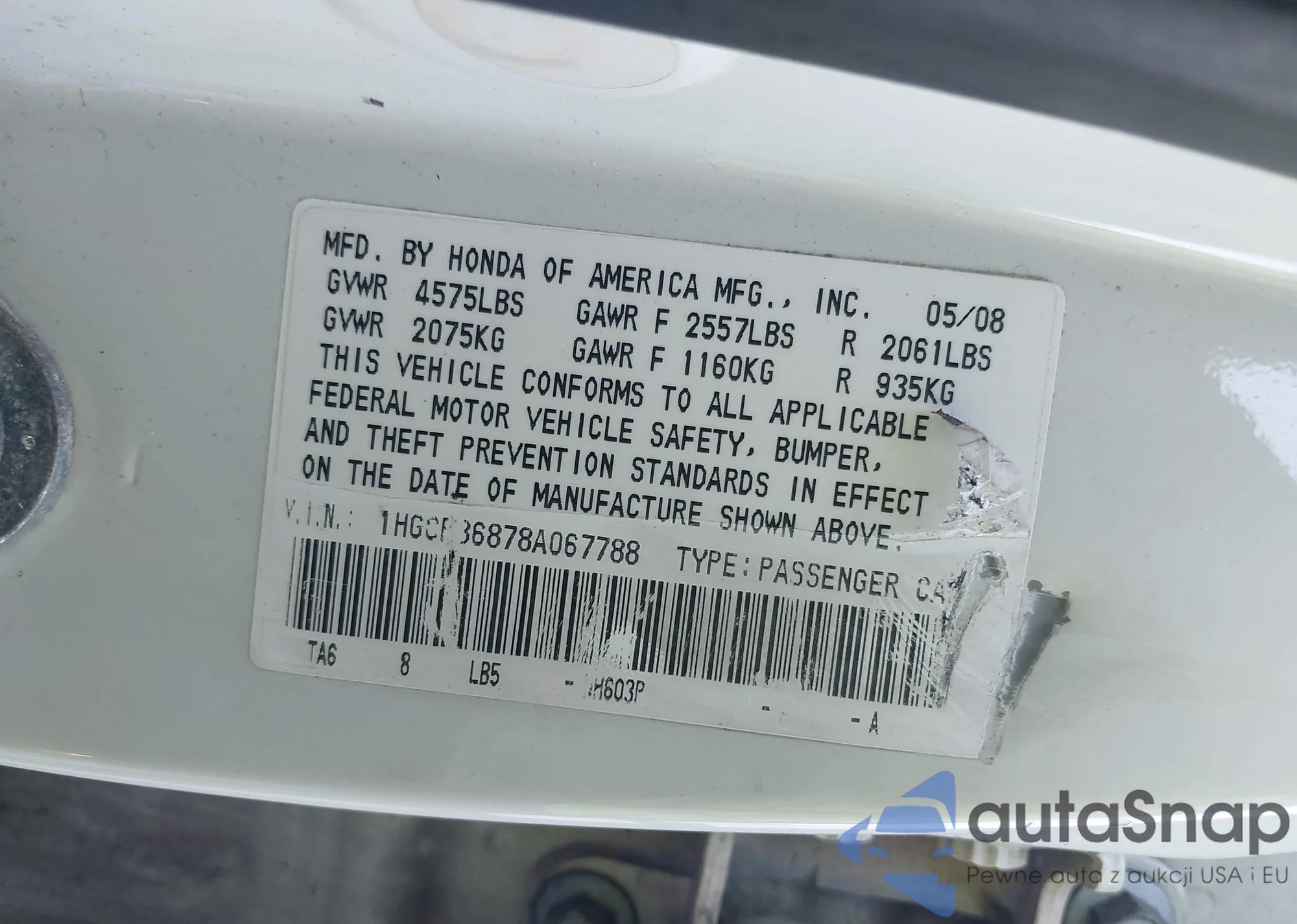 VIN: 1HGCP36878A067788