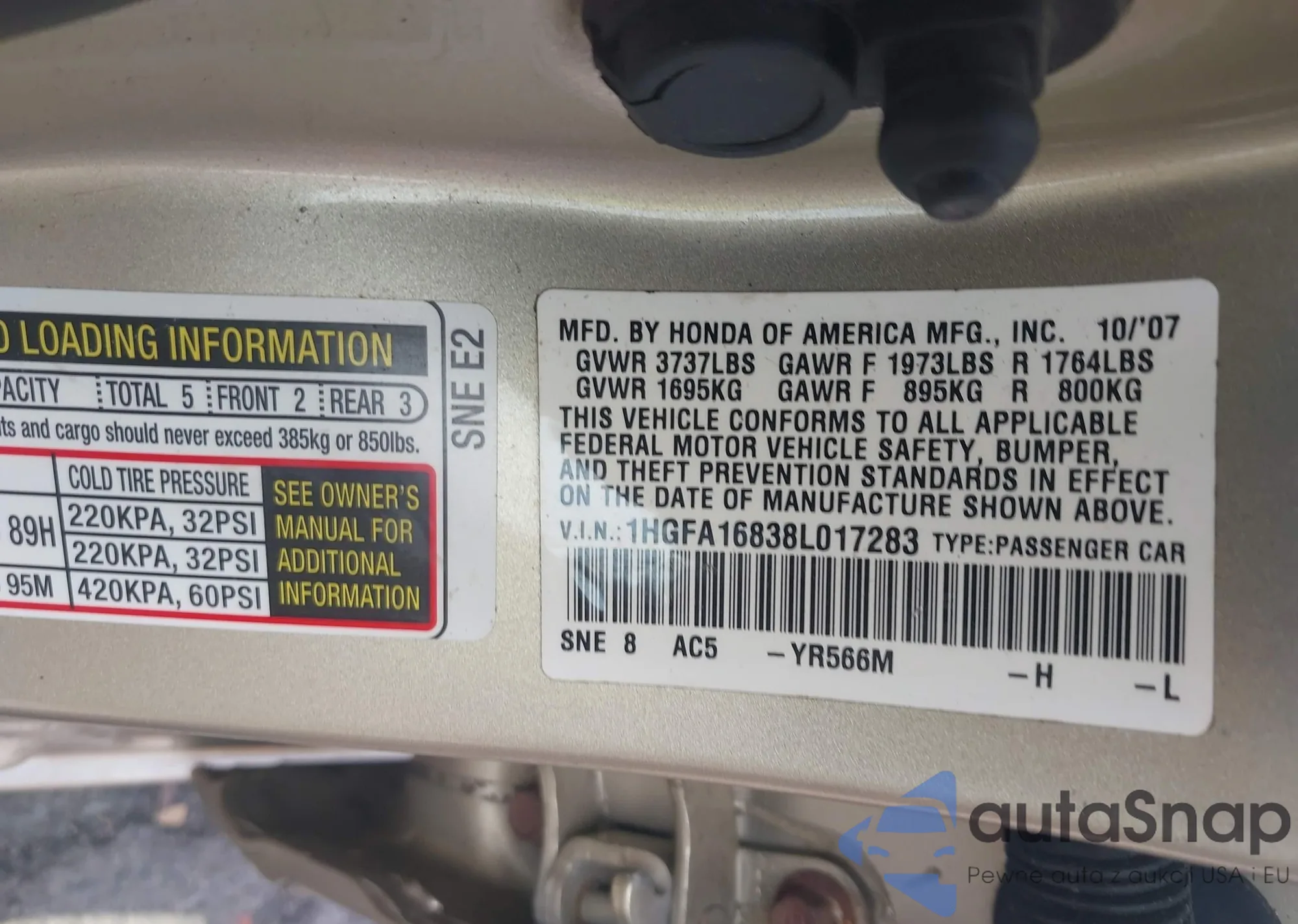 • VIN: 1HGFA16838L017283