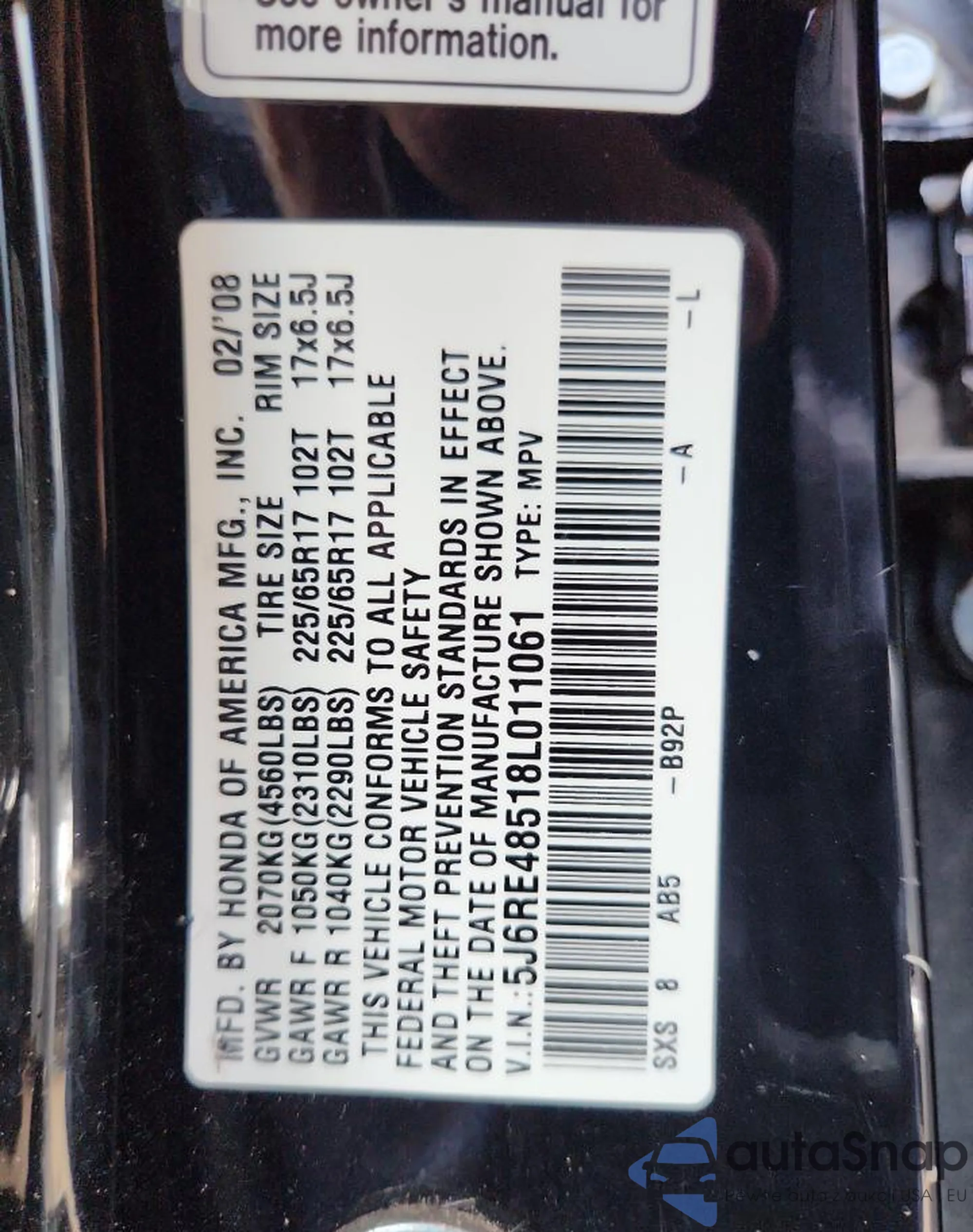 VIN: 5J6RE48518L011061