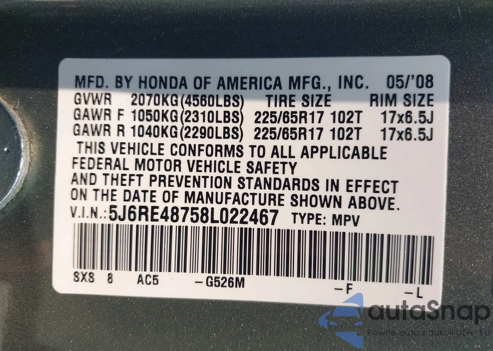 VIN: 5J6RE48758L022467