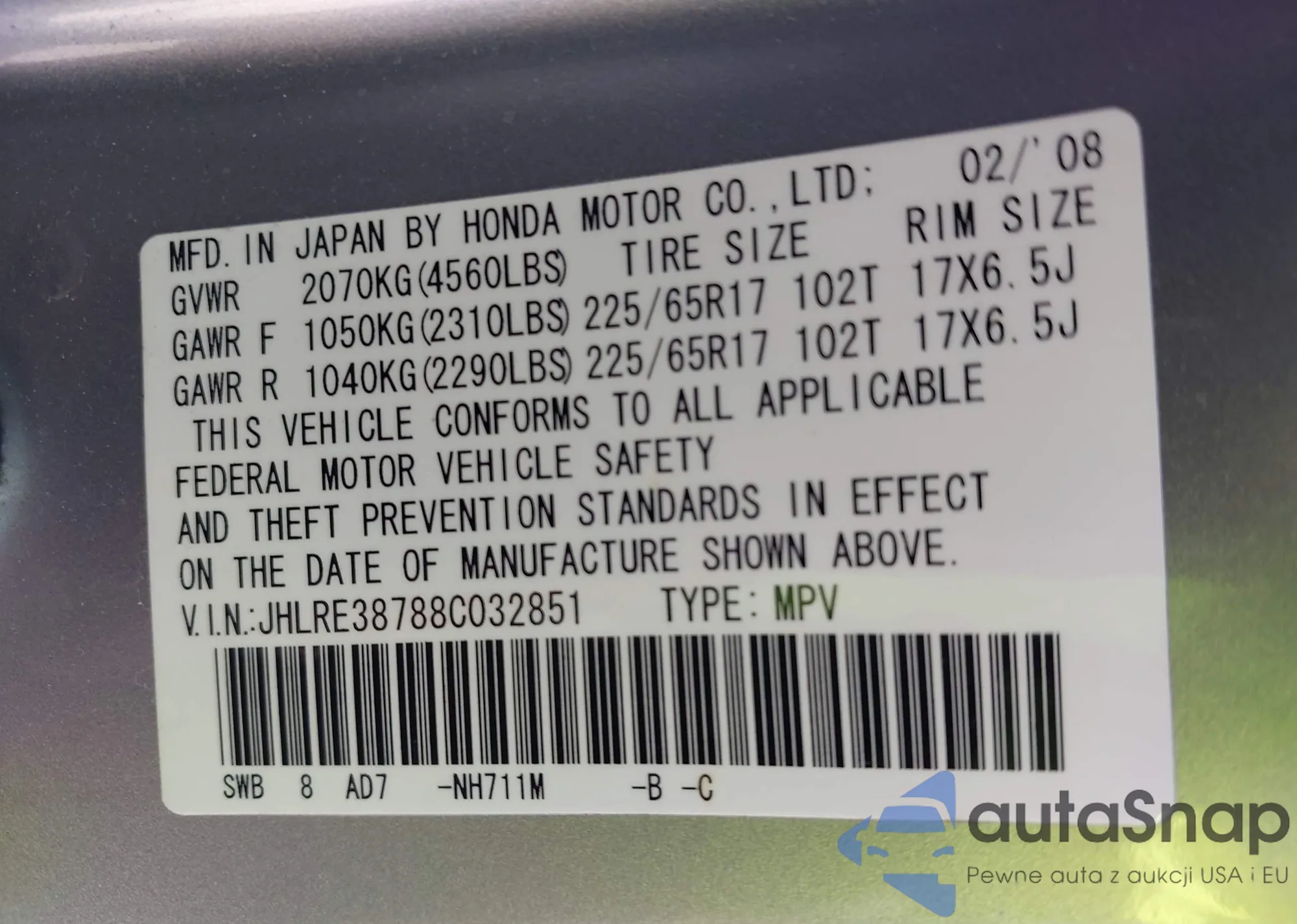 VIN: JHLRE38788C032851
