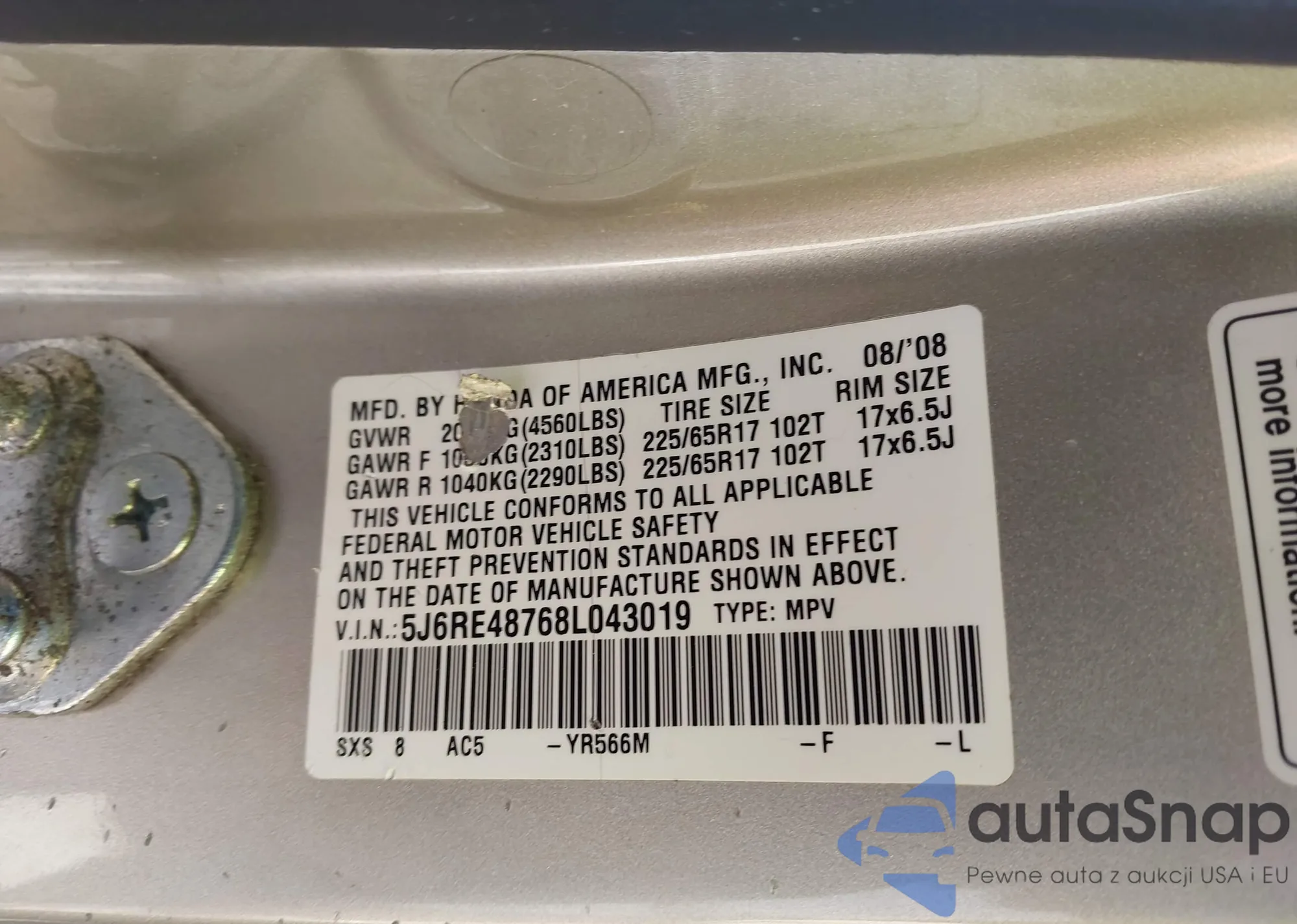 VIN: 5J6RE48768L043019
