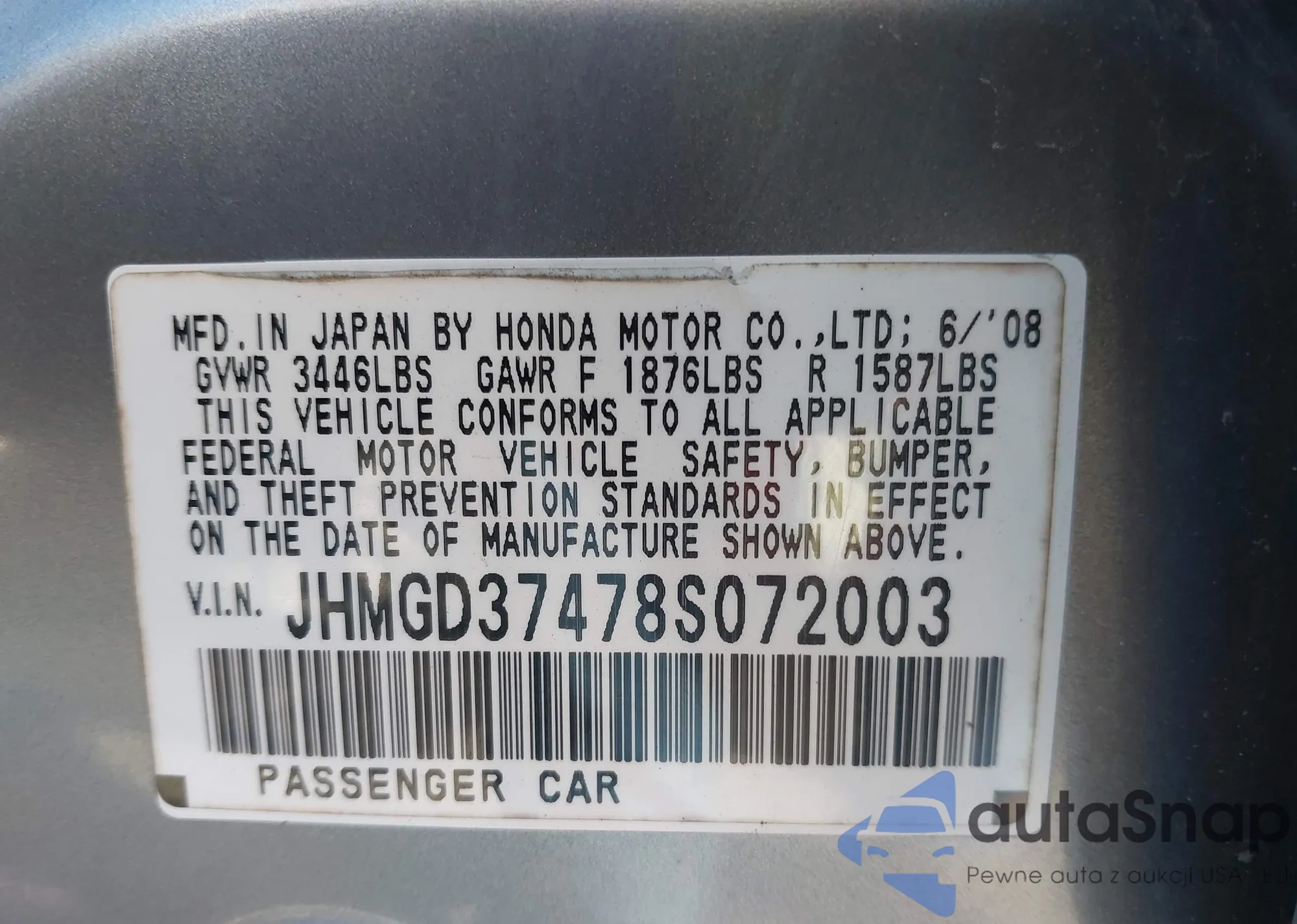 • VIN: JHMGD37478S072003