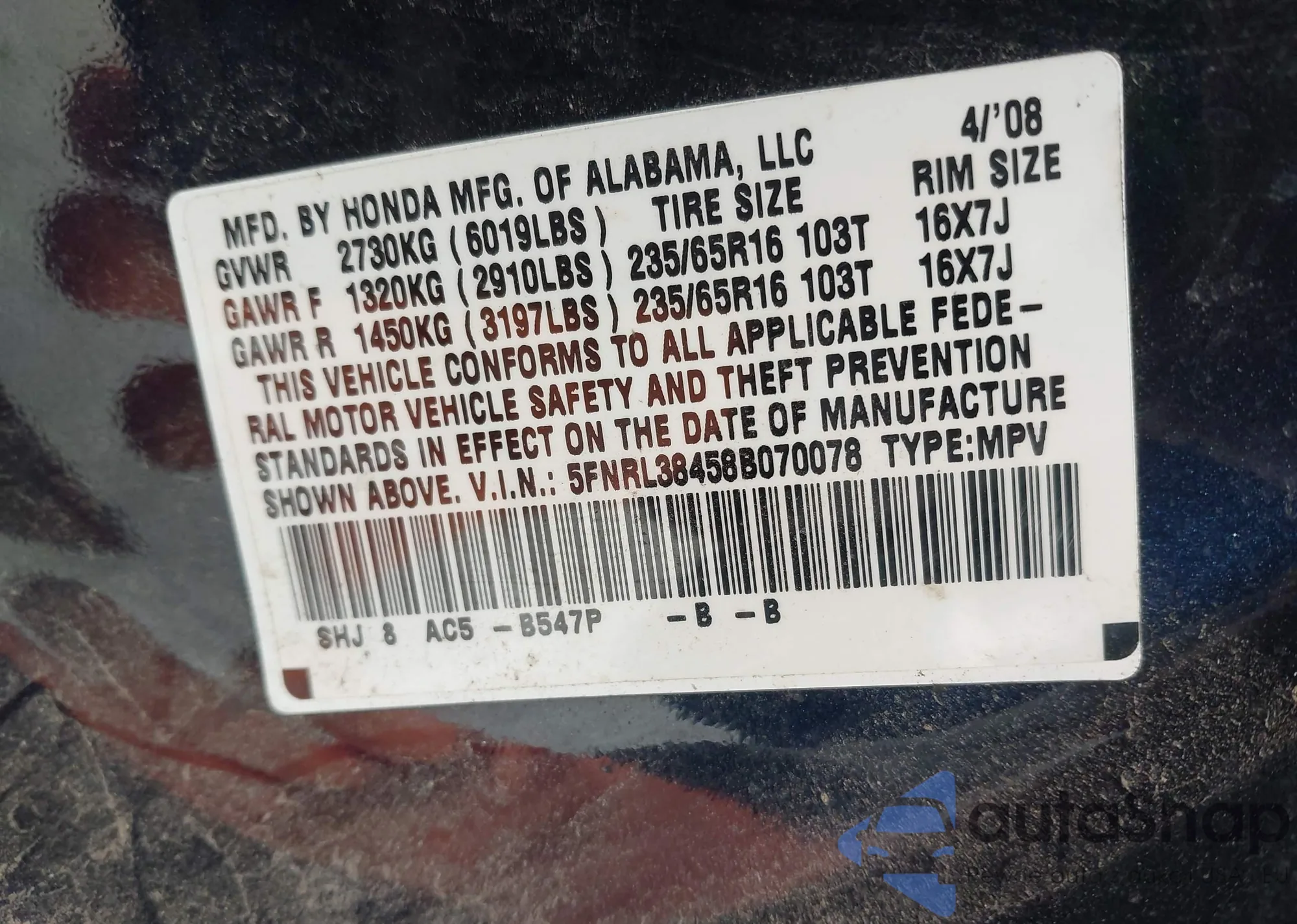 VIN: 5FNRL38458B070078