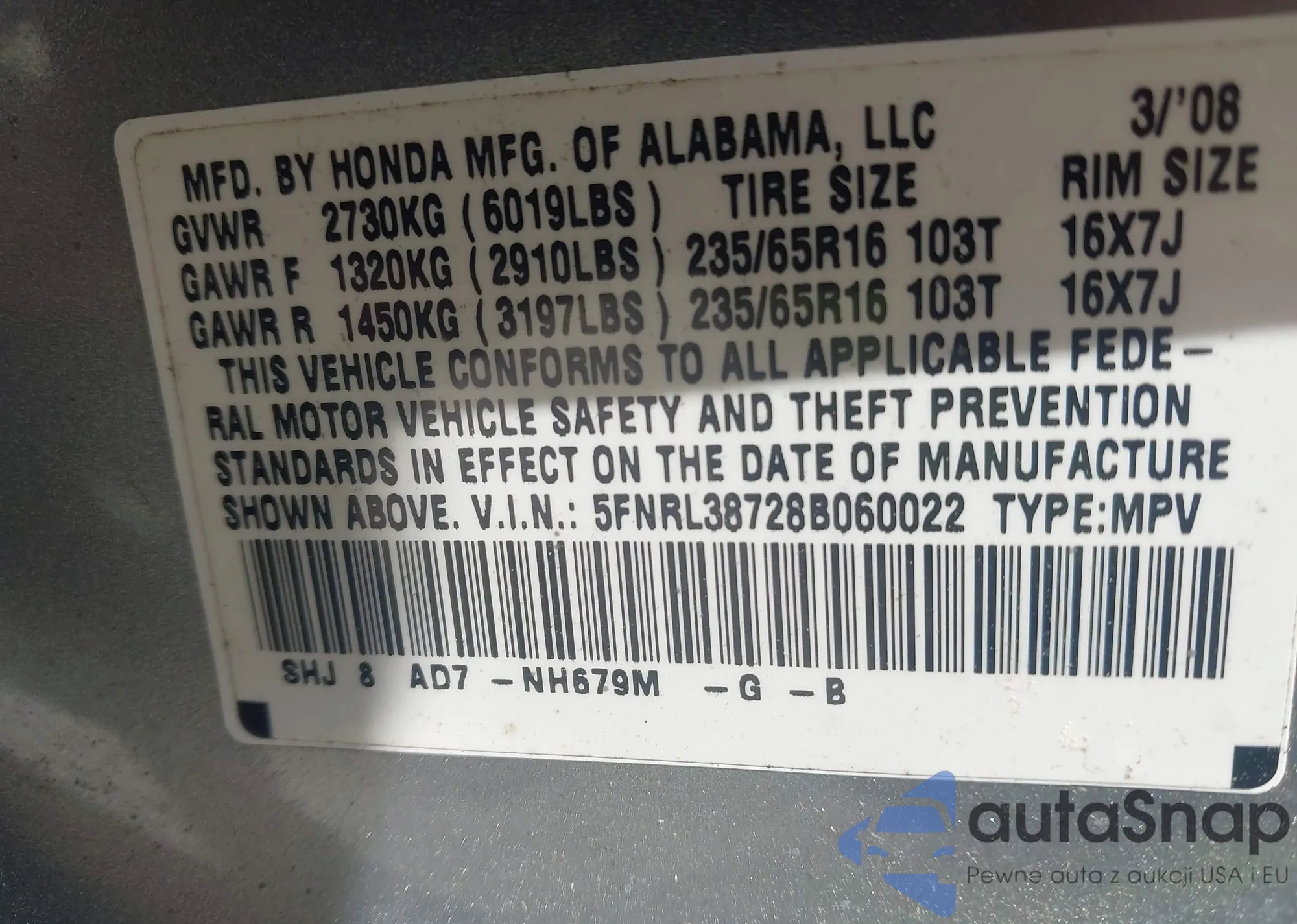 VIN: 5FNRL38728B060022