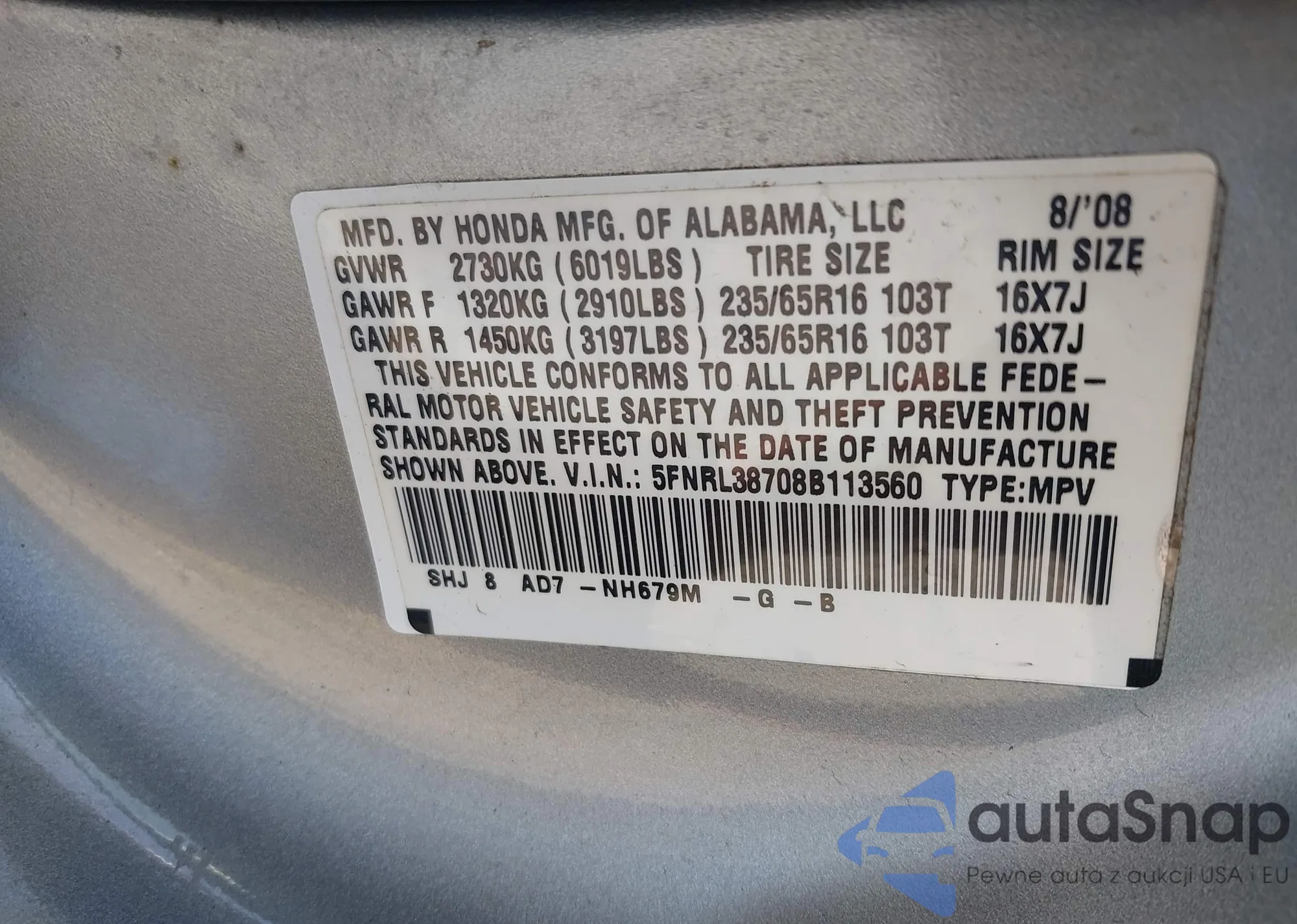 VIN: 5FNRL38708B113560
