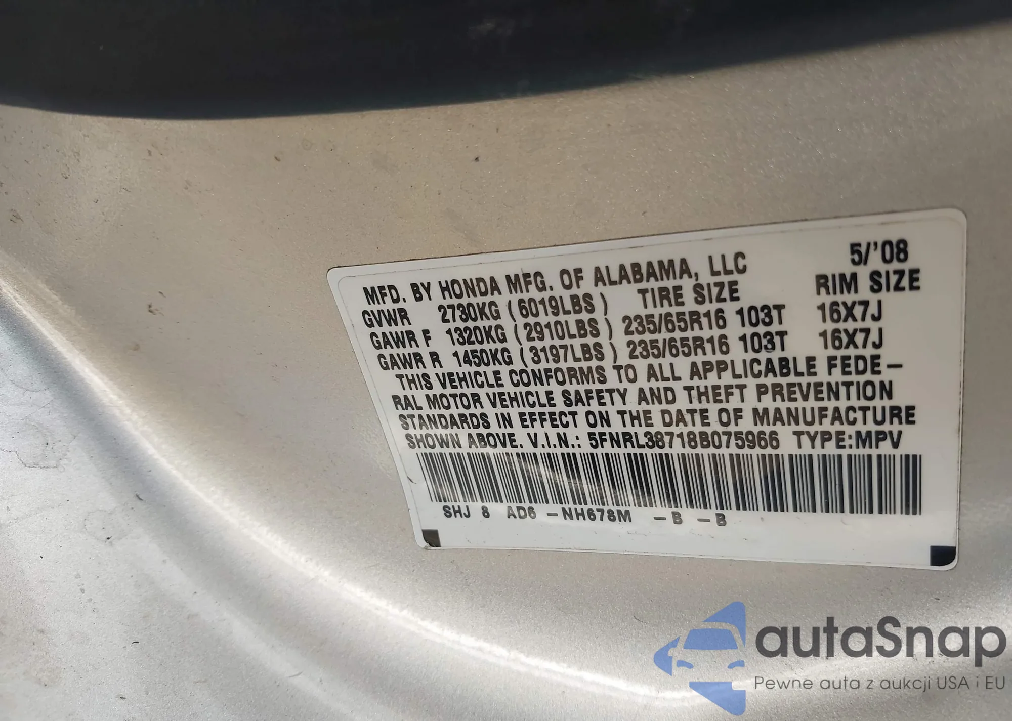 VIN: 5FNRL38718B075966