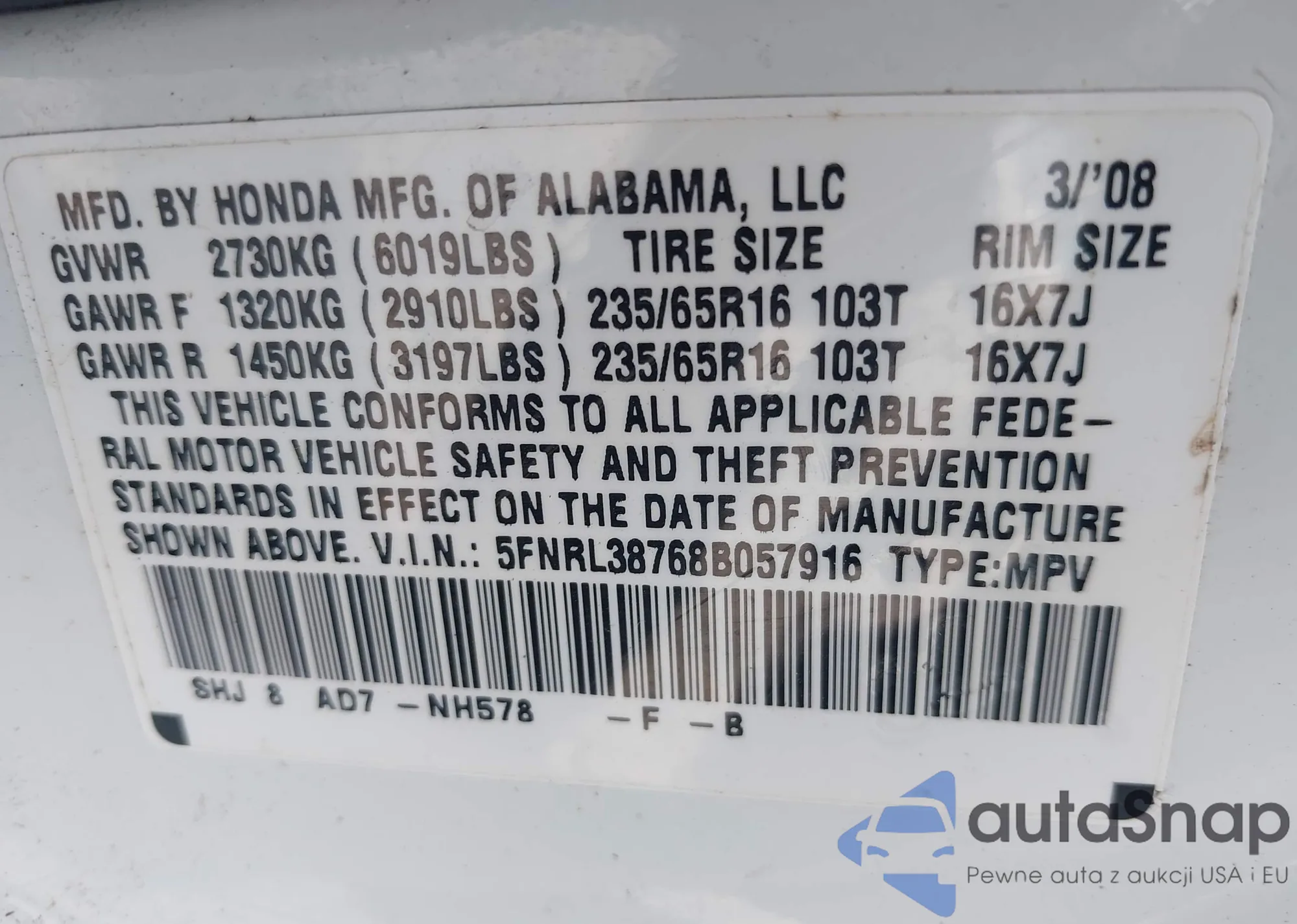 VIN: 5FNRL38768B057916