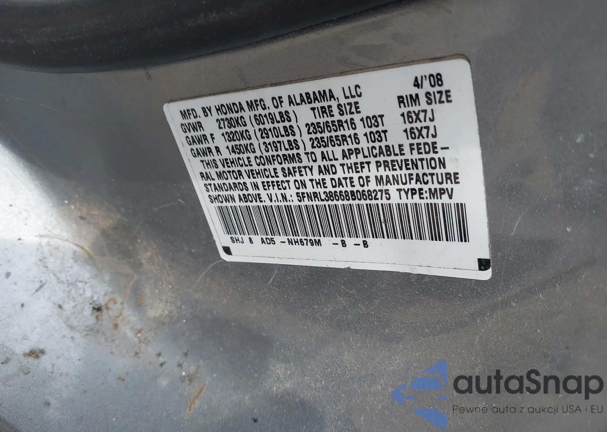 VIN: 5FNRL38668B068275