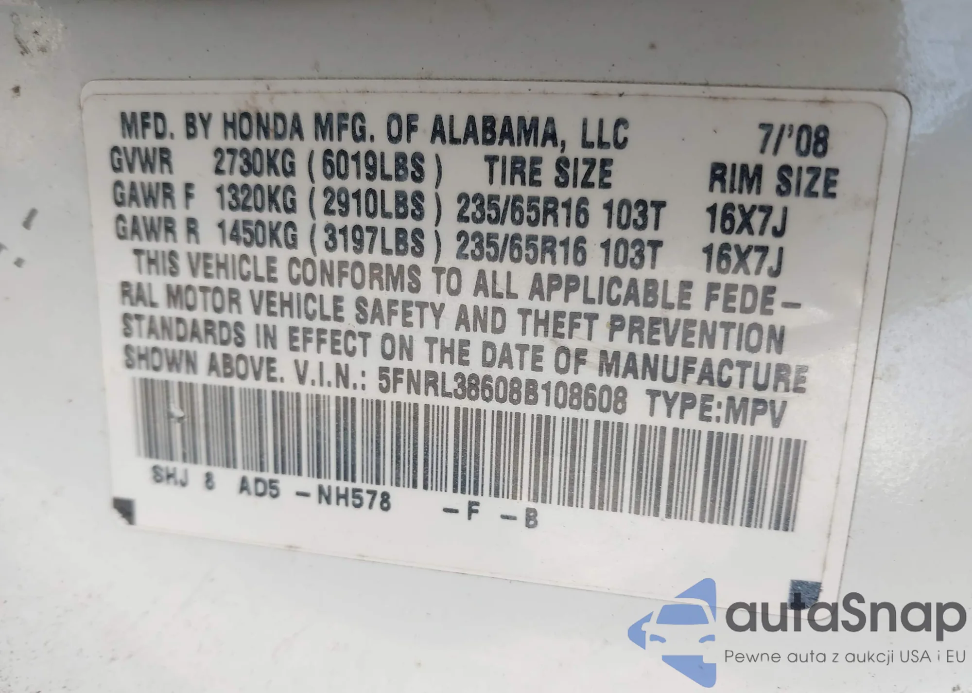 VIN: 5FNRL38608B108608