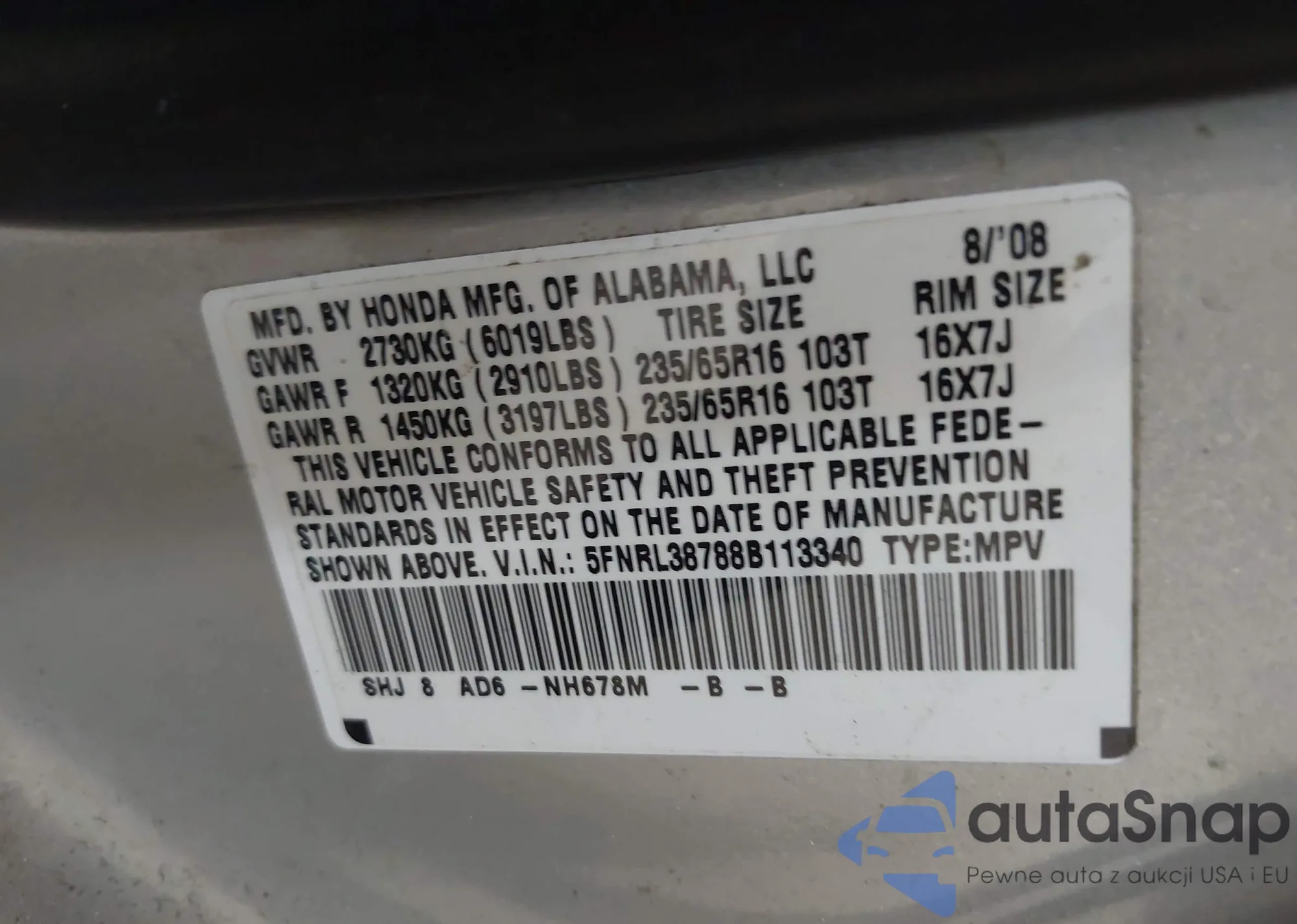 VIN: 5FNRL38788B113340