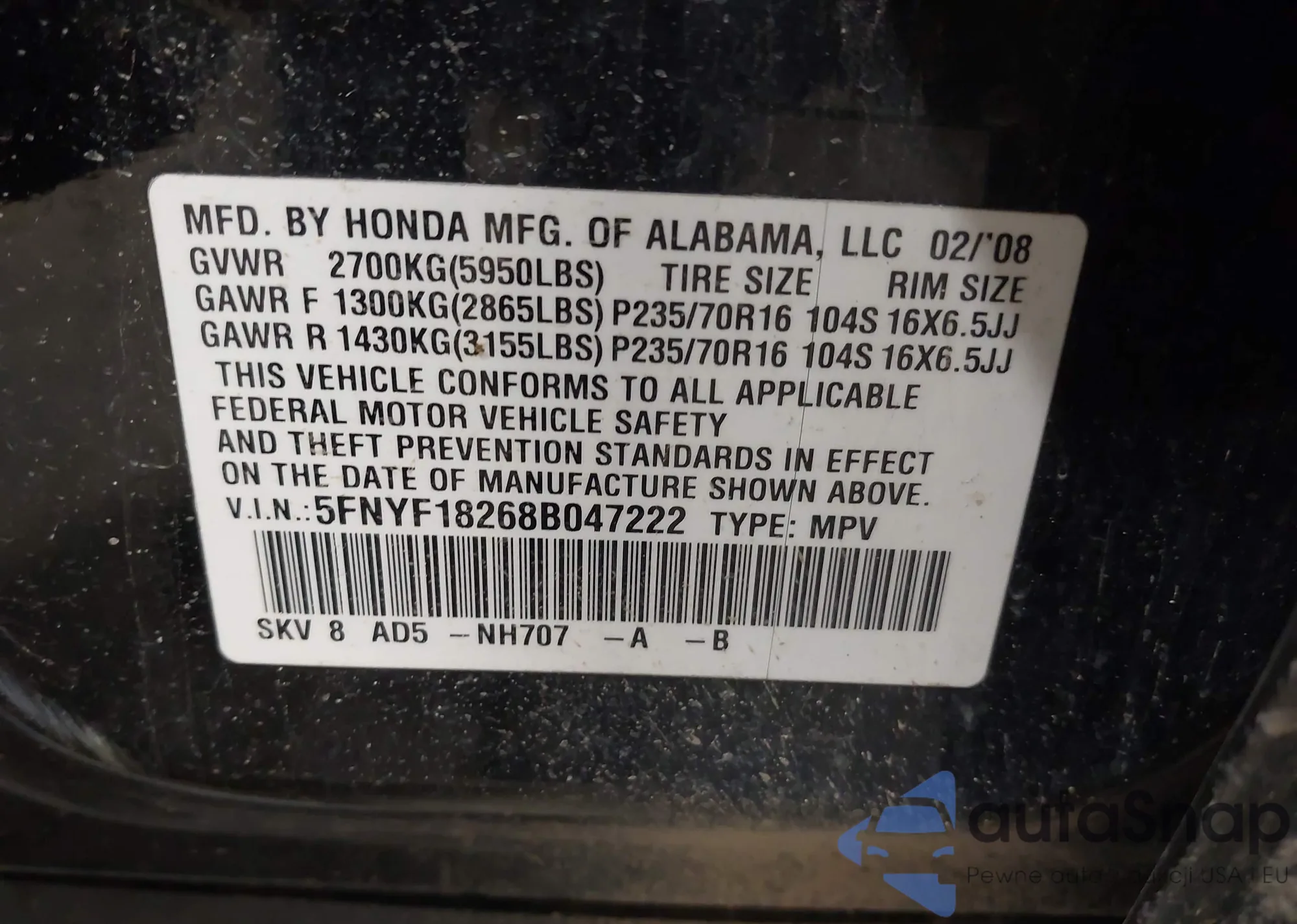 VIN: 5FNYF18268B047222