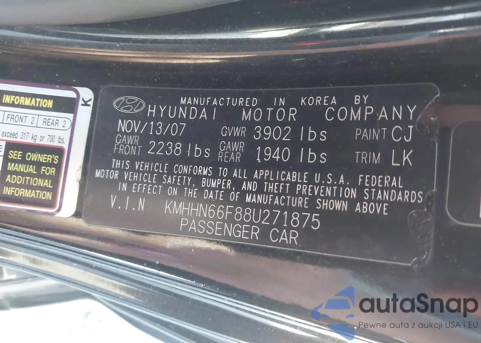 Samochód Hyundai Tiburon 2008 (VIN KMHHN66F88U271875) nie był wcześniej licytowany. Dokumenty są czyste, przebieg odpowiada lub jest niższy niż średnia rynku. Sprzedaje go firma ubezpieczeniowa – polecamy zakup. Dostawa do portu zajmie ok. 6–8 tygodni.