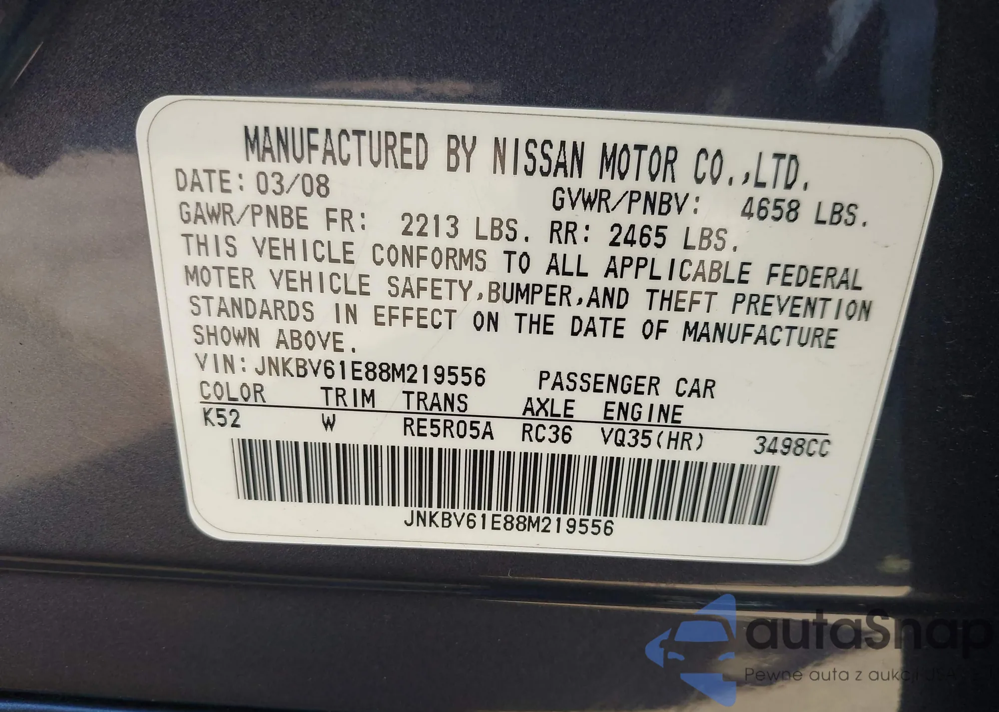 Samochód Infiniti G 2008 (VIN JNKBV61E88M219556) nie był wcześniej licytowany. Dokumenty są czyste, przebieg odpowiada lub jest niższy niż średnia rynku. Sprzedaje go firma ubezpieczeniowa – polecamy zakup. Dostawa do portu zajmie ok. 6–8 tygodni.