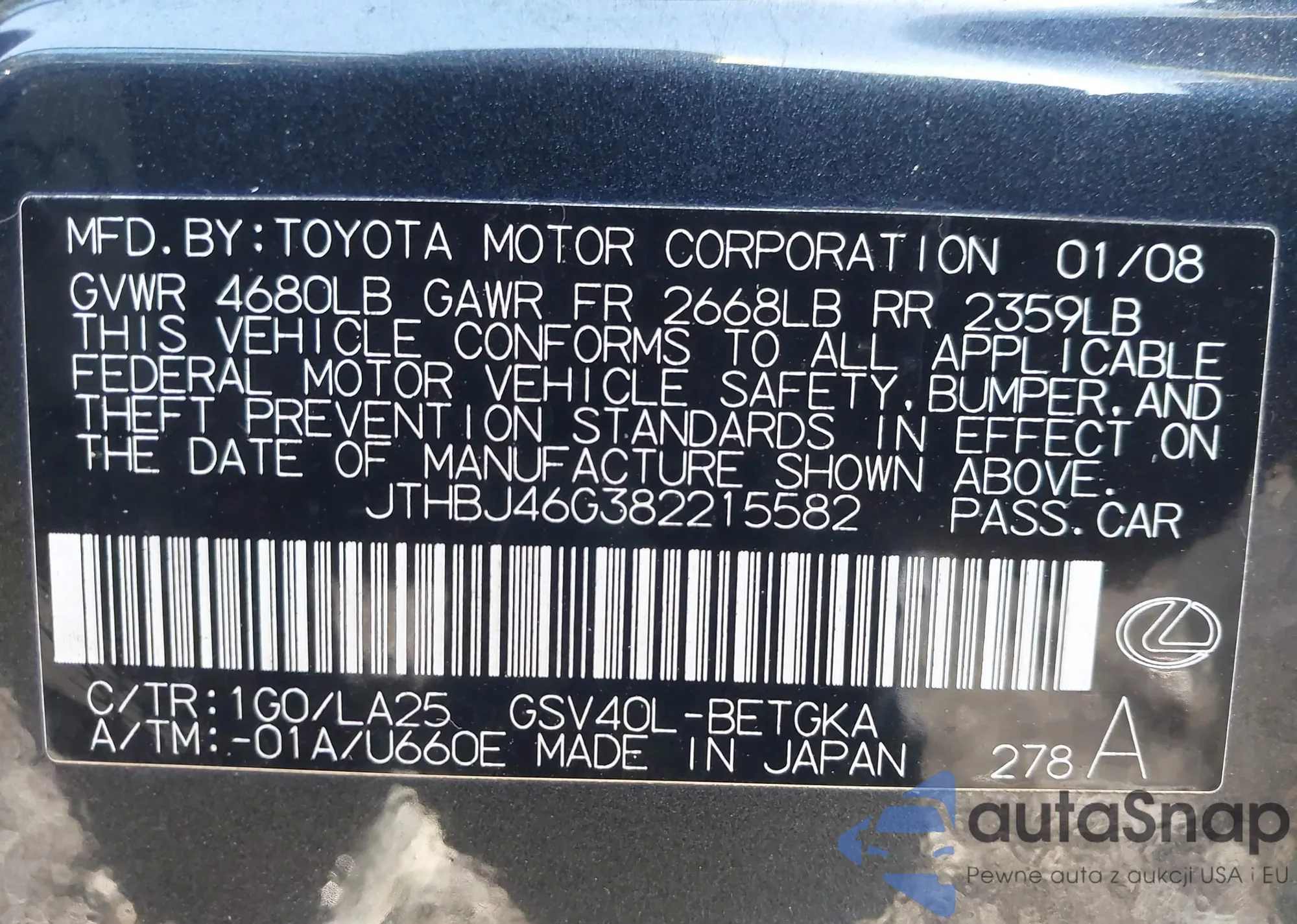 • VIN: JTHBJ46G382215582