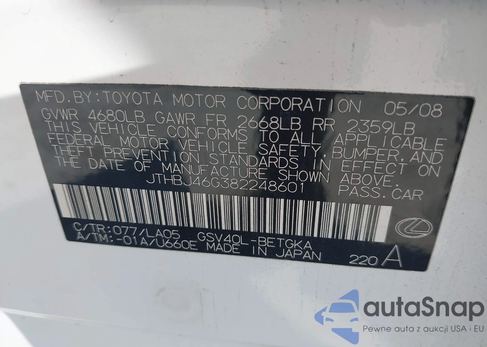 VIN: JTHBJ46G382248601