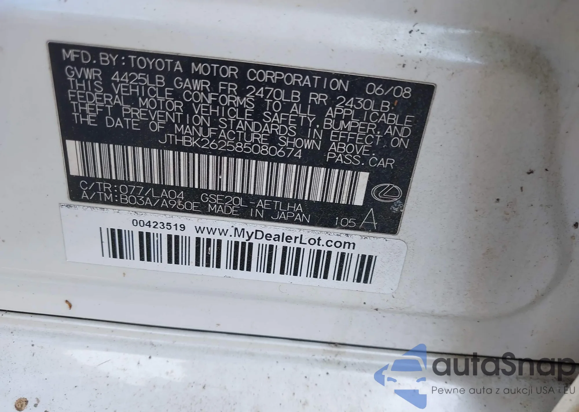 Lexus IS 2008 – Historia pojazdu (sprzedany na IAAI)