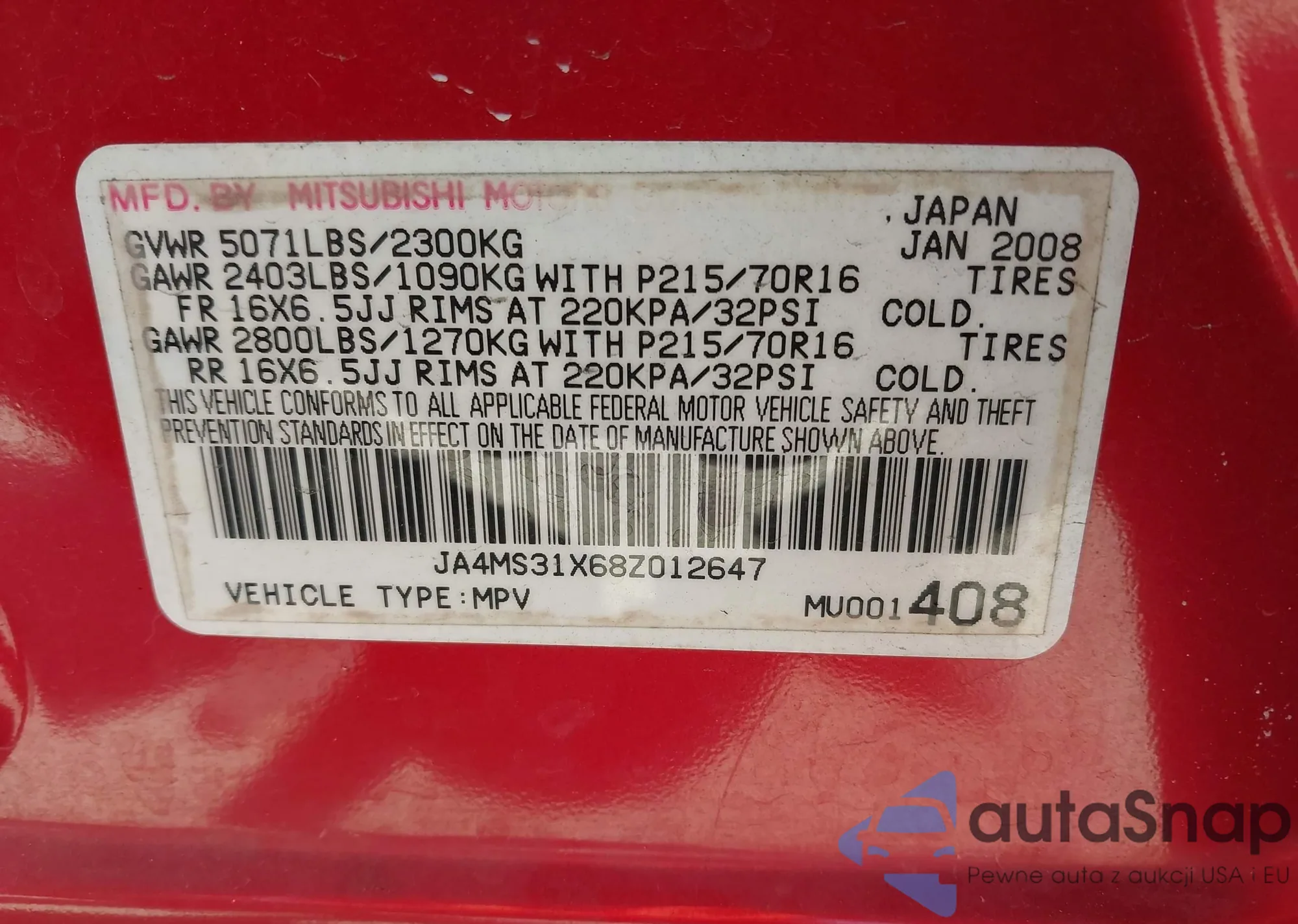 • VIN: JA4MS31X68Z012647