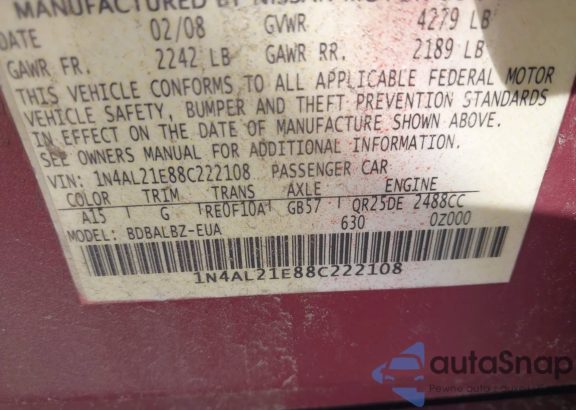 VIN: 1N4AL21E88C222108
