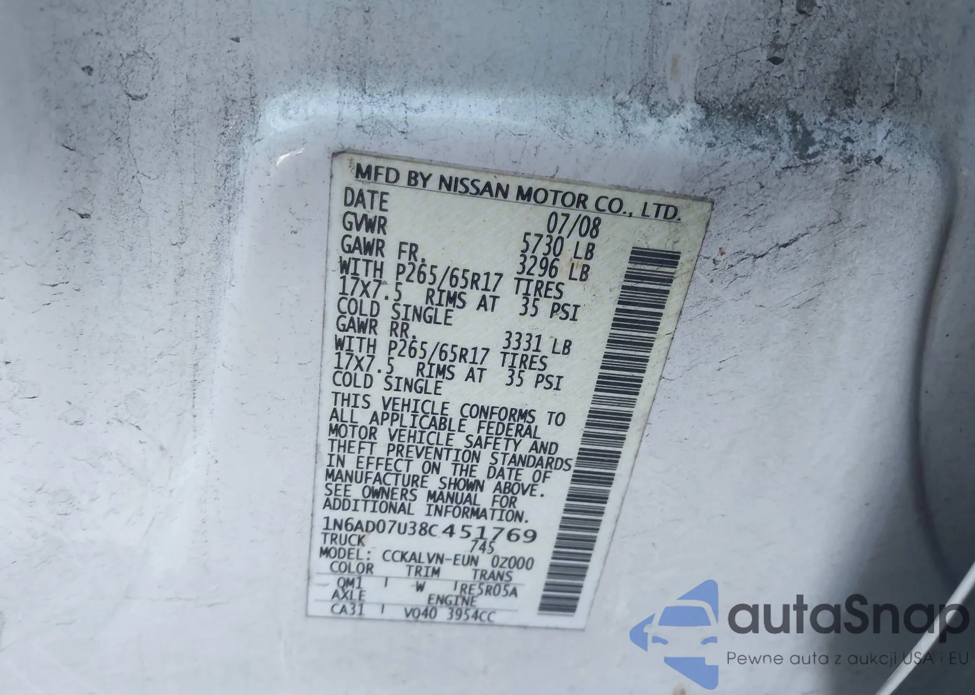 Samochód Nissan Navara (Frontier) 2008 (VIN 1N6AD07U38C451769) nie był wcześniej licytowany. Dokumenty są czyste, przebieg odpowiada lub jest niższy niż średnia rynku. Sprzedaje go firma ubezpieczeniowa – polecamy zakup. Dostawa do portu zajmie ok. 6–8 tygodni.