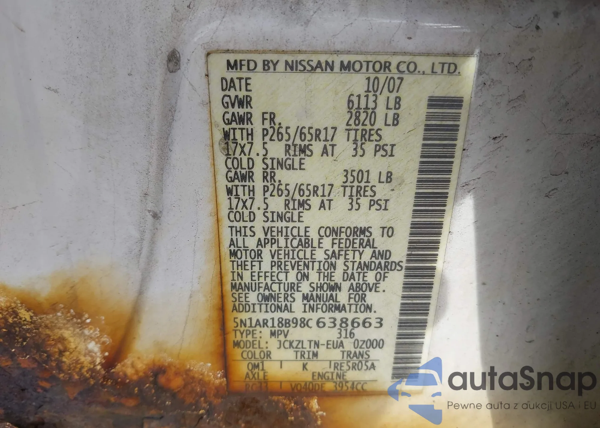 Samochód Nissan Pathfinder 2008 (VIN 5N1AR18B98C638663) ma dokumenty uniemożliwiające rejestrację. Mogą pojawić się trudności przy eksporcie i rejestracji. Skontaktuj się z ekspertami AutaSnap w celu znalezienia alternatywy.