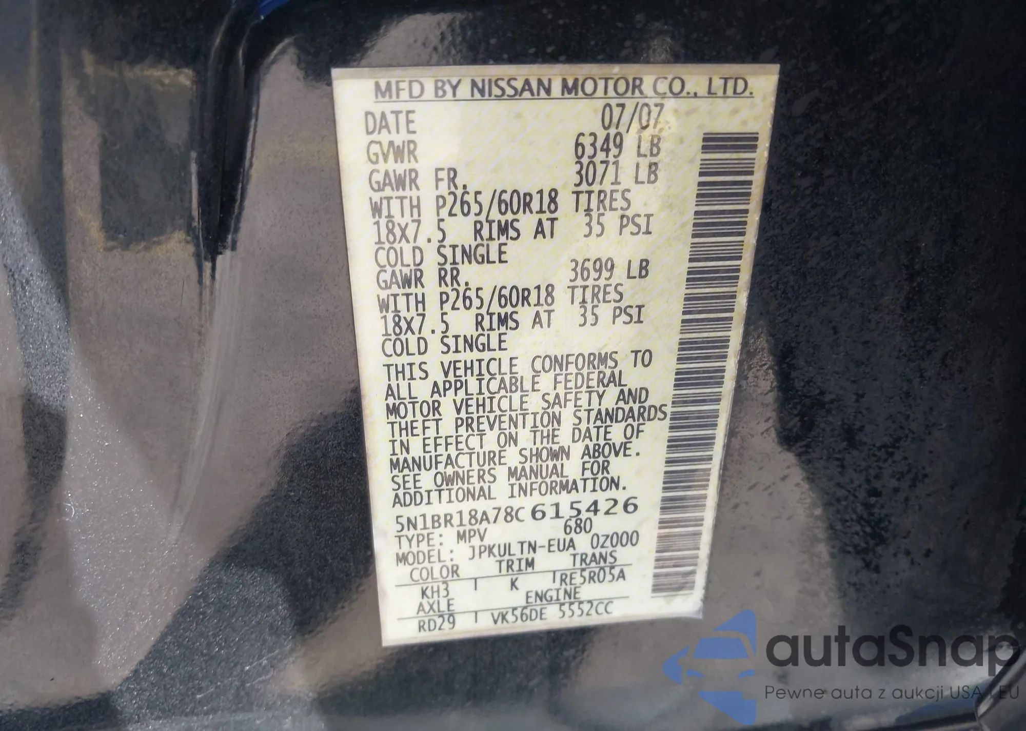 Samochód Nissan Pathfinder 2008 (VIN 5N1BR18A78C615426) ma dokumenty uniemożliwiające rejestrację. Mogą pojawić się trudności przy eksporcie i rejestracji. Skontaktuj się z ekspertami AutaSnap w celu znalezienia alternatywy.