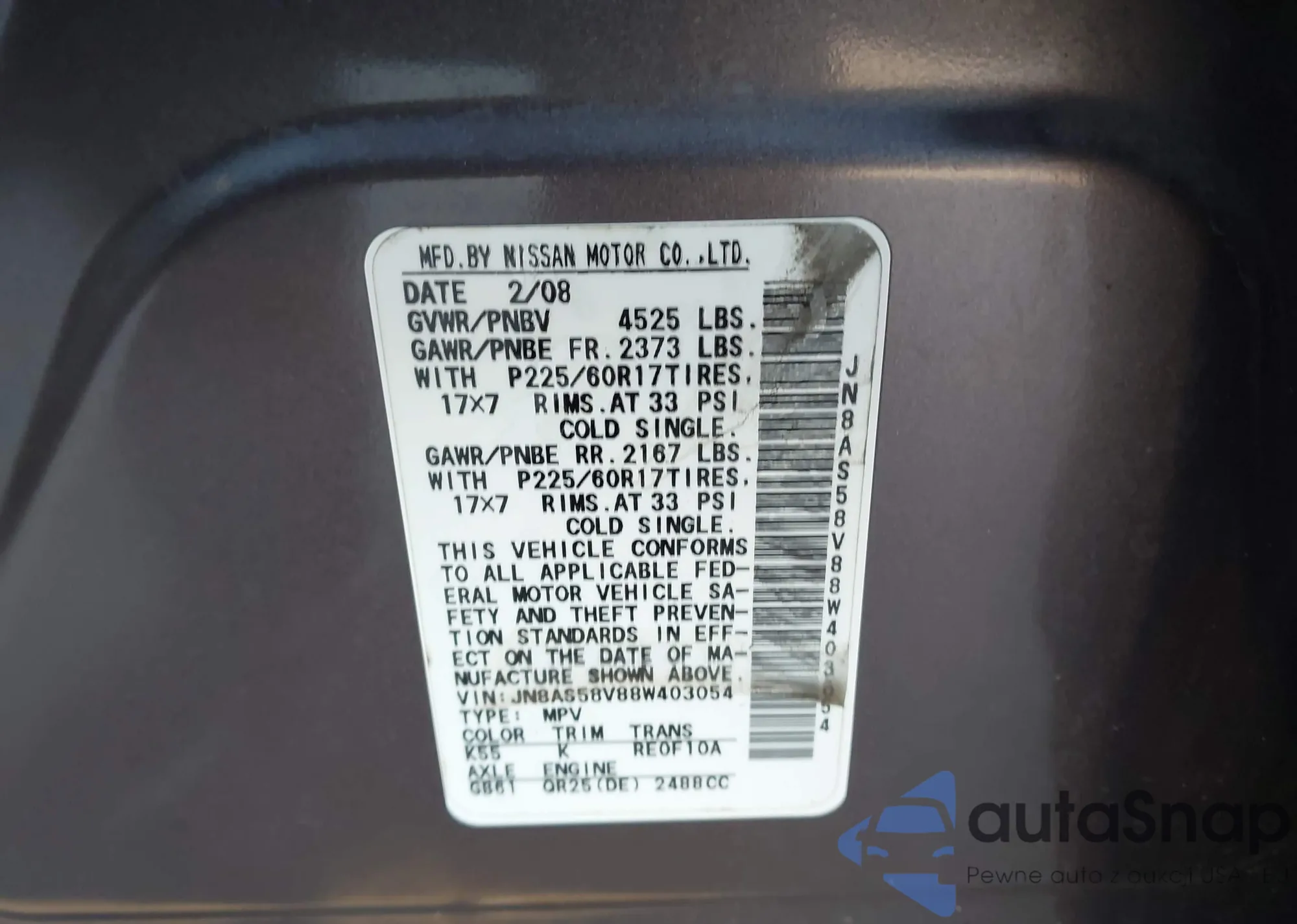 Samochód Nissan Rogue 2008 (VIN JN8AS58V88W403054) nie był wcześniej licytowany. Dokumenty są czyste, przebieg odpowiada lub jest niższy niż średnia rynku. Sprzedaje go firma ubezpieczeniowa – polecamy zakup. Dostawa do portu zajmie ok. 6–8 tygodni.