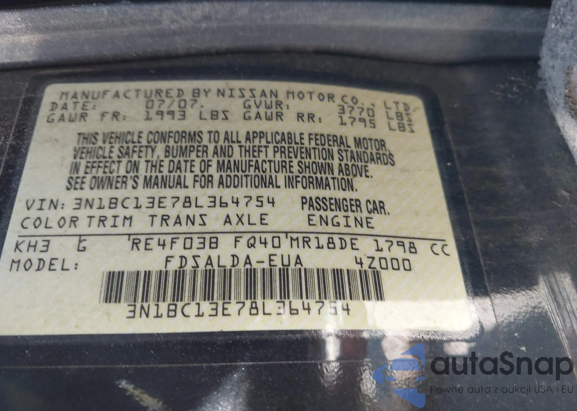 Samochód Nissan Versa 2008 (VIN 3N1BC13E78L364754) nie był wcześniej licytowany. Dokumenty są czyste, przebieg odpowiada lub jest niższy niż średnia rynku. Sprzedaje go firma ubezpieczeniowa – polecamy zakup. Dostawa do portu zajmie ok. 6–8 tygodni.