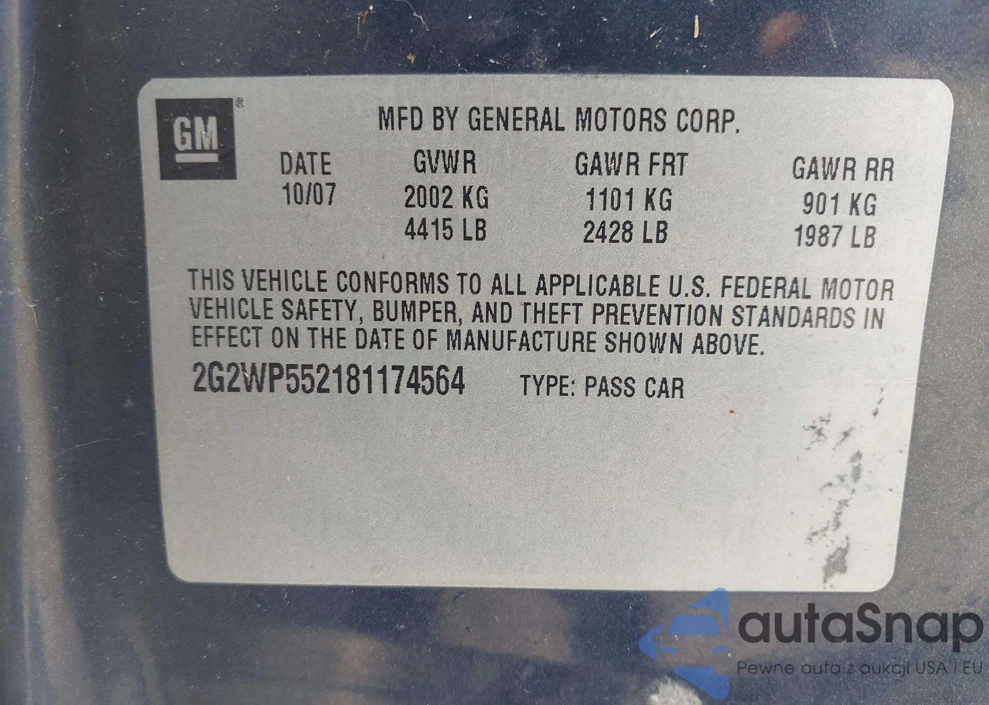 Samochód Pontiac Grand Prix 2008 (VIN 2G2WP552181174564) ma dokumenty uniemożliwiające rejestrację. Mogą pojawić się trudności przy eksporcie i rejestracji. Skontaktuj się z ekspertami AutaSnap w celu znalezienia alternatywy.