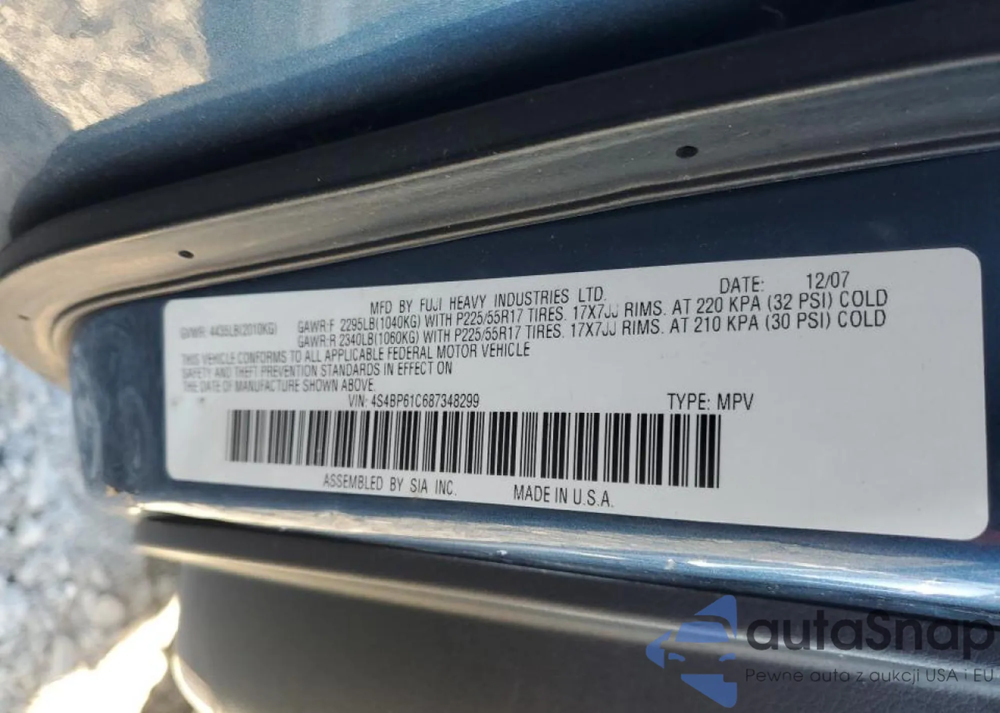 Samochód Subaru Outback 2008 (VIN 4S4BP61C687348299) sprzedaje go niezweryfikowany sprzedawca. Zalecamy raport Carfax i potwierdzenie możliwości rejestracji pojazdu przed zakupem.
