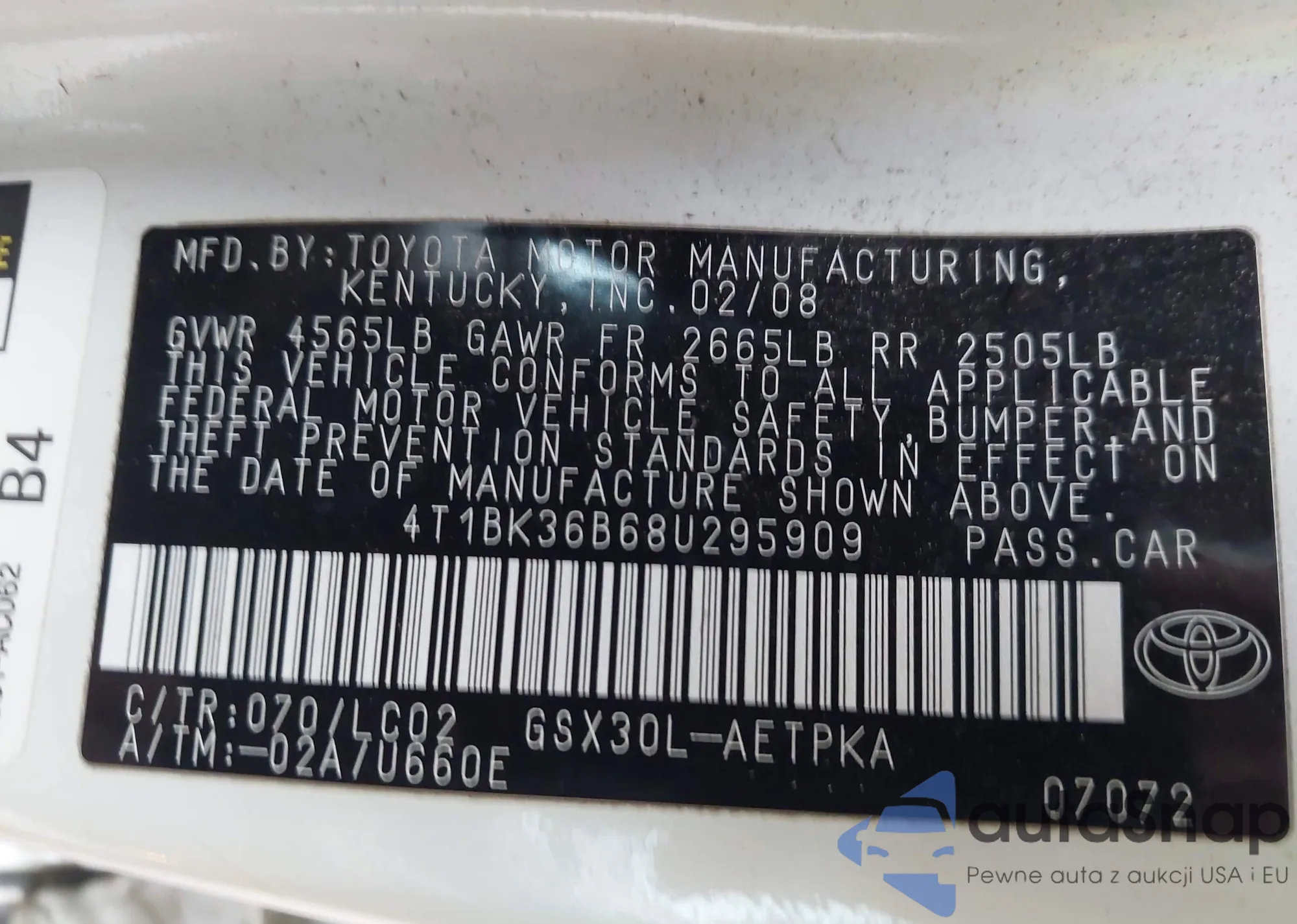 VIN: 4T1BK36B68U295909
