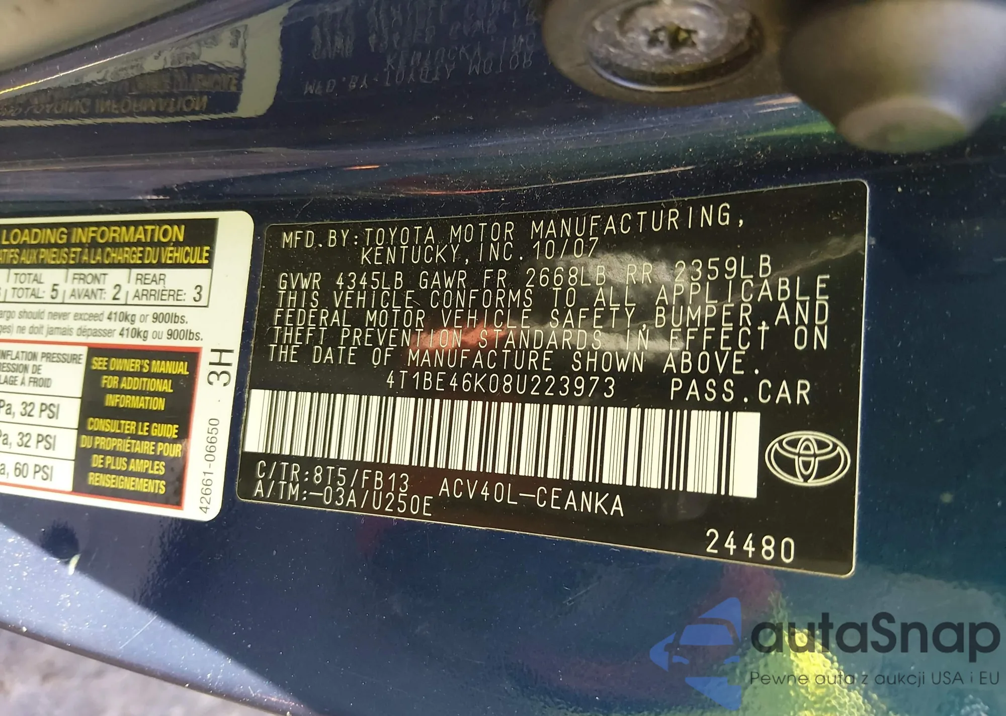 Samochód Toyota Camry 2008 (VIN 4T1BE46K08U223973) był już licytowany 1 razy i/lub sprzedaje go niezweryfikowany sprzedawca. Zalecamy raport Carfax i potwierdzenie możliwości rejestracji pojazdu przed zakupem.