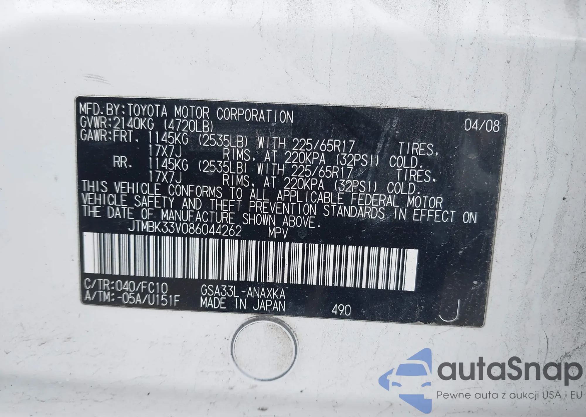 VIN: JTMBK33V086044262