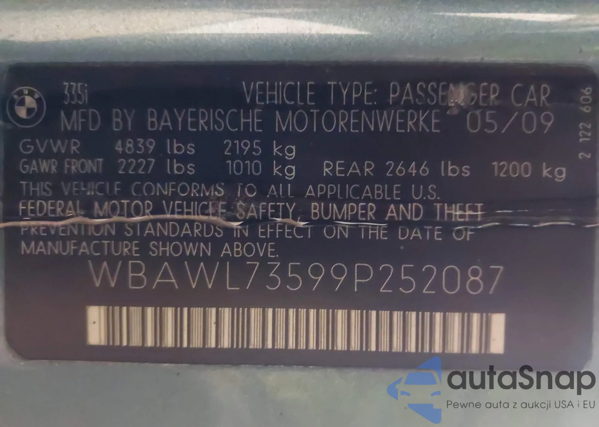 Samochód BMW 3er 2009 (VIN WBAWL73599P252087) nie był wcześniej licytowany. Dokumenty są czyste, przebieg odpowiada lub jest niższy niż średnia rynku. Sprzedaje go firma ubezpieczeniowa – polecamy zakup. Dostawa do portu zajmie ok. 6–8 tygodni.