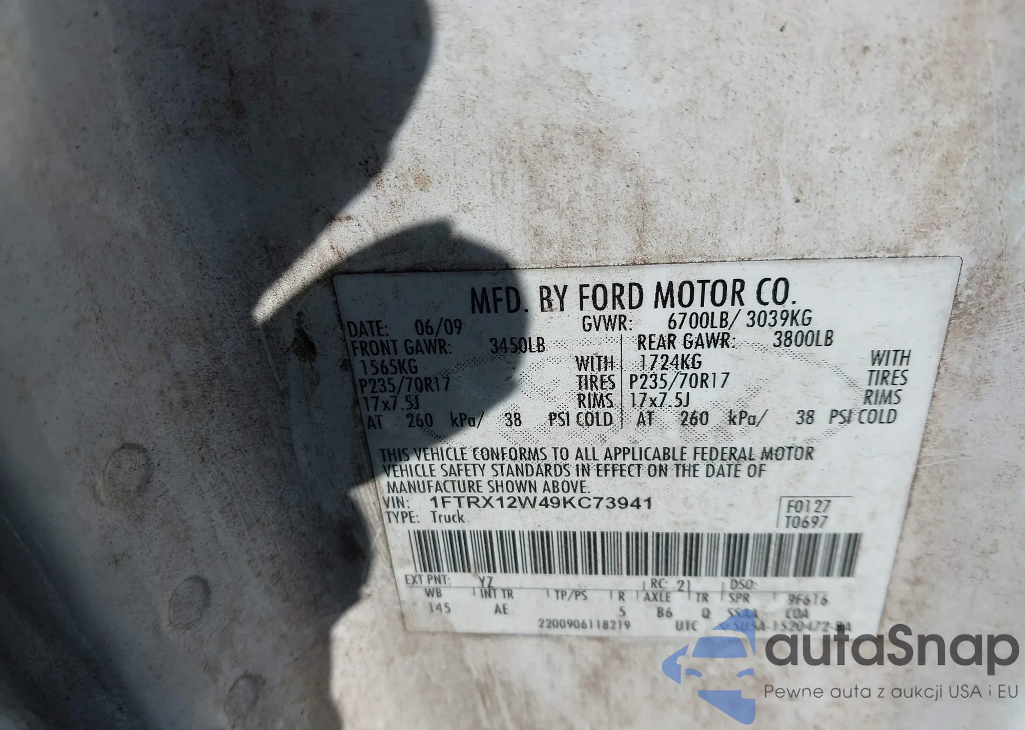 Samochód Ford F-150 2009 (VIN 1FTRX12W49KC73941) sprzedaje go niezweryfikowany sprzedawca. Zalecamy raport Carfax i potwierdzenie możliwości rejestracji pojazdu przed zakupem.