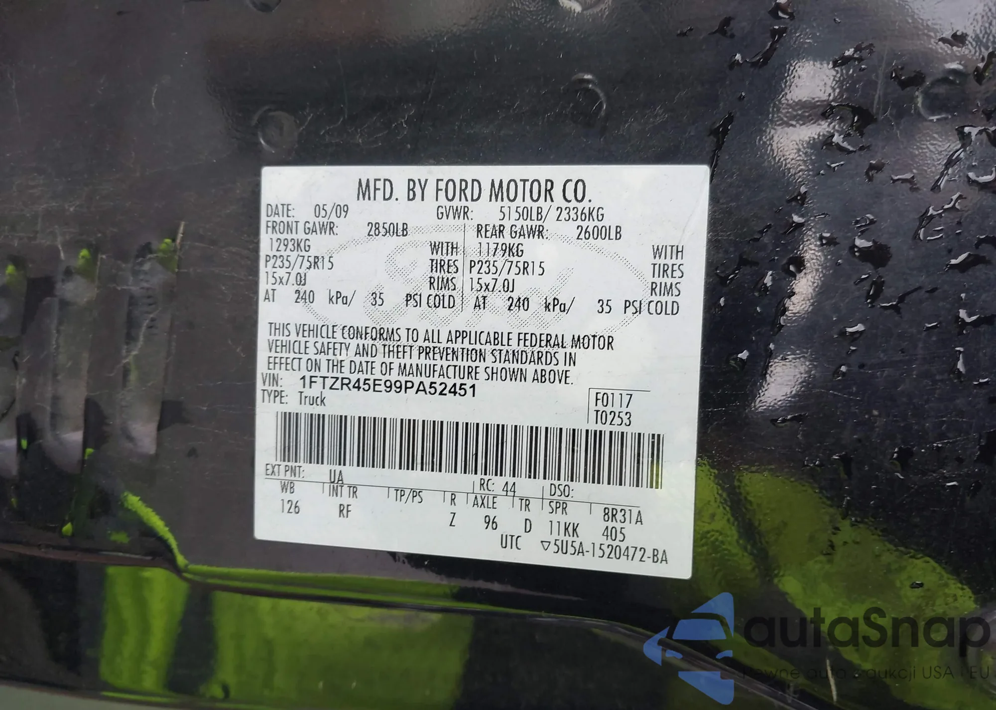 Samochód Ford Ranger 2009 (VIN 1FTZR45E99PA52451) nie był wcześniej licytowany. Dokumenty są czyste, przebieg odpowiada lub jest niższy niż średnia rynku. Sprzedaje go firma ubezpieczeniowa – polecamy zakup. Dostawa do portu zajmie ok. 6–8 tygodni.