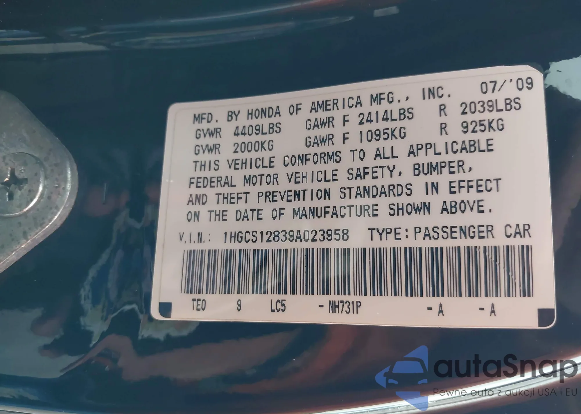 VIN: 1HGCS12839A023958